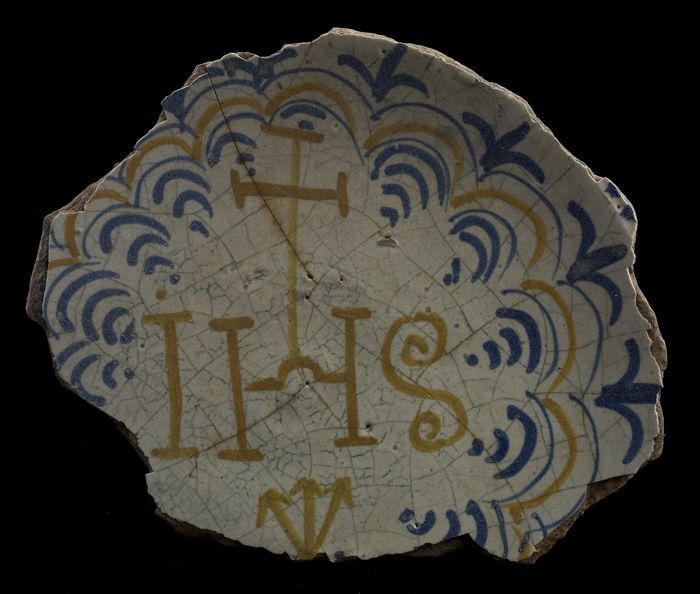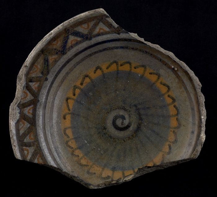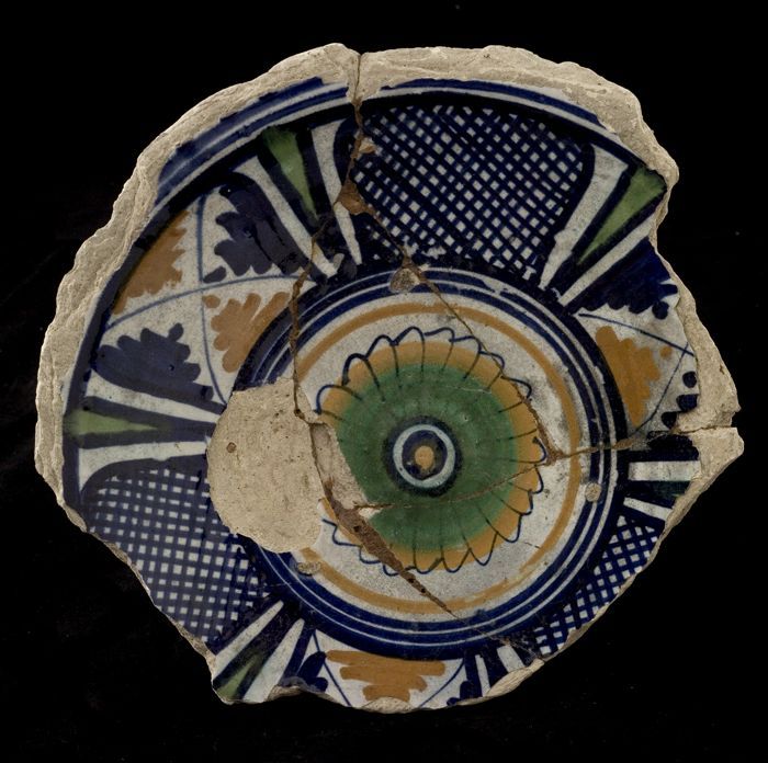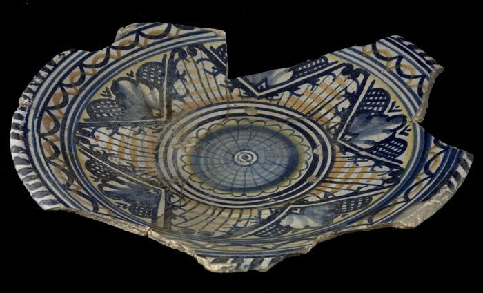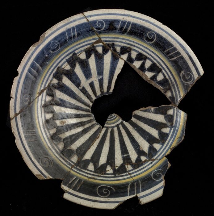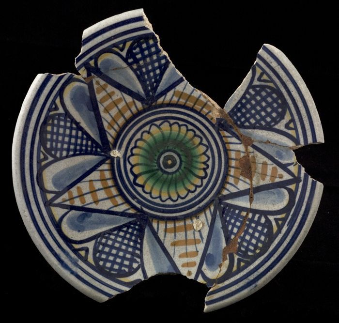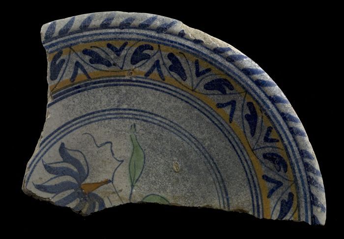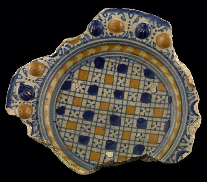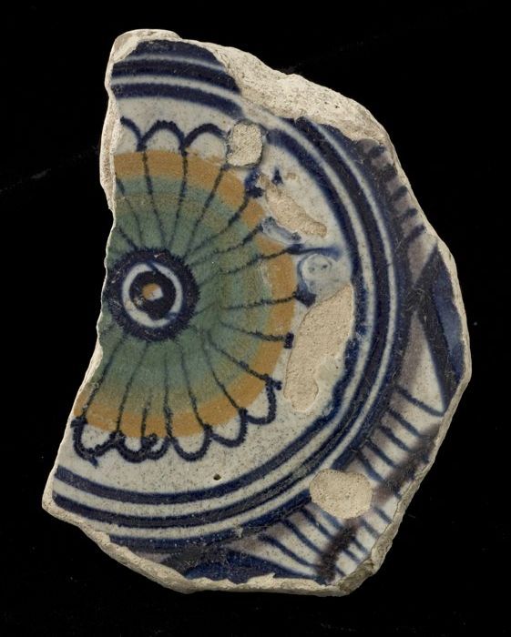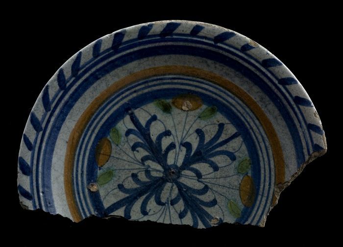 Fragment majolica kom of bord, polychroom, achtpunti...