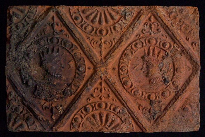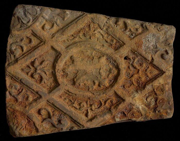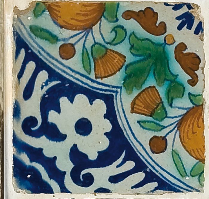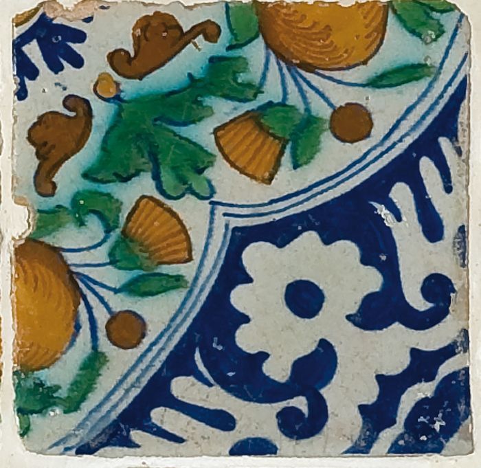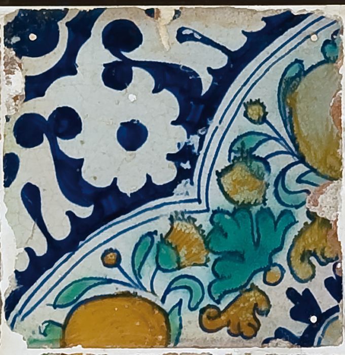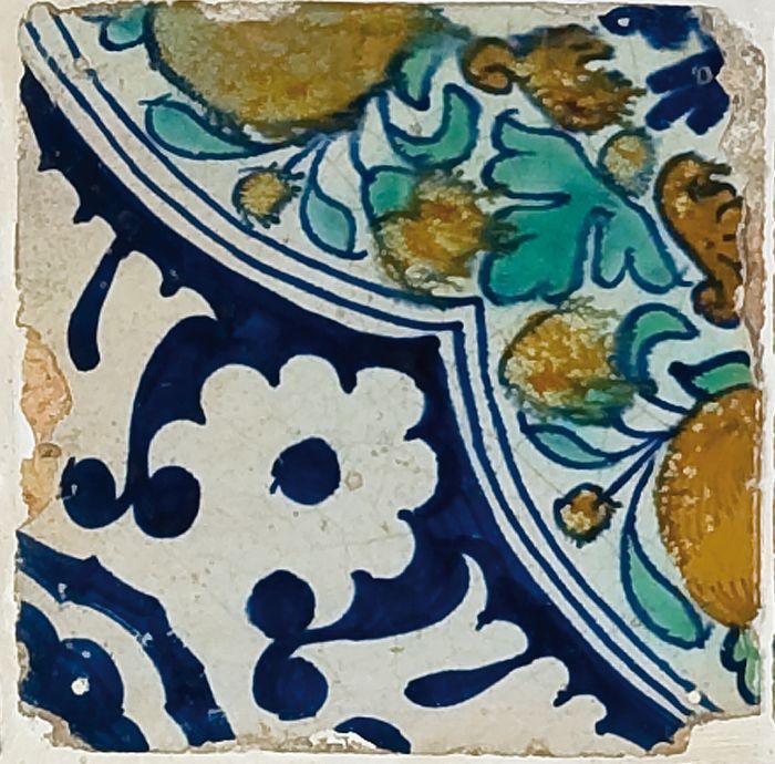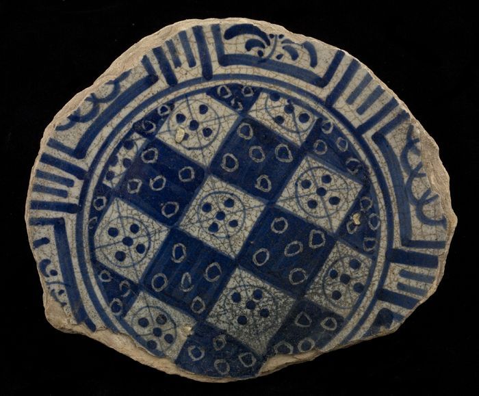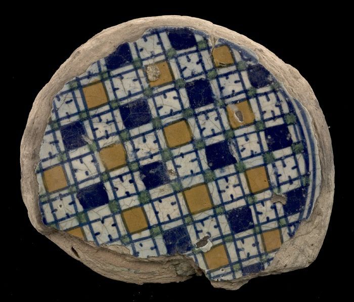 Fragment majolica bord, polychroom, schaakbord-motief