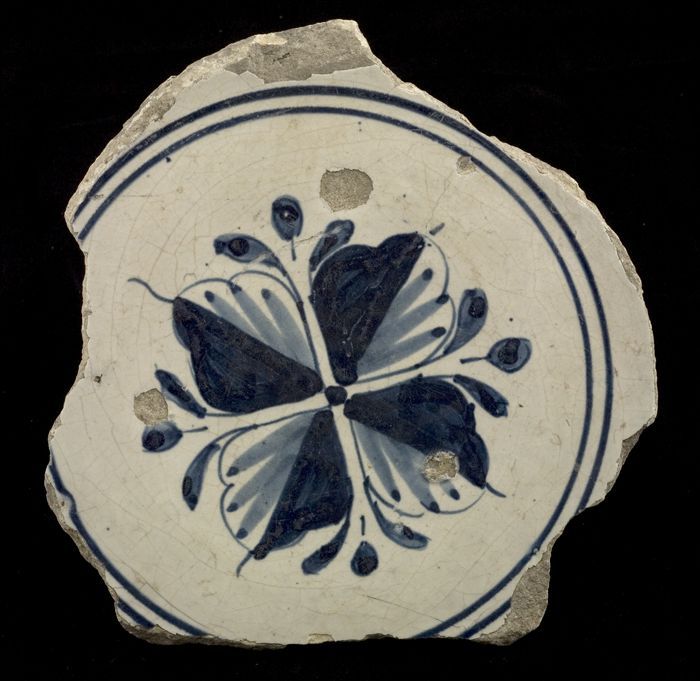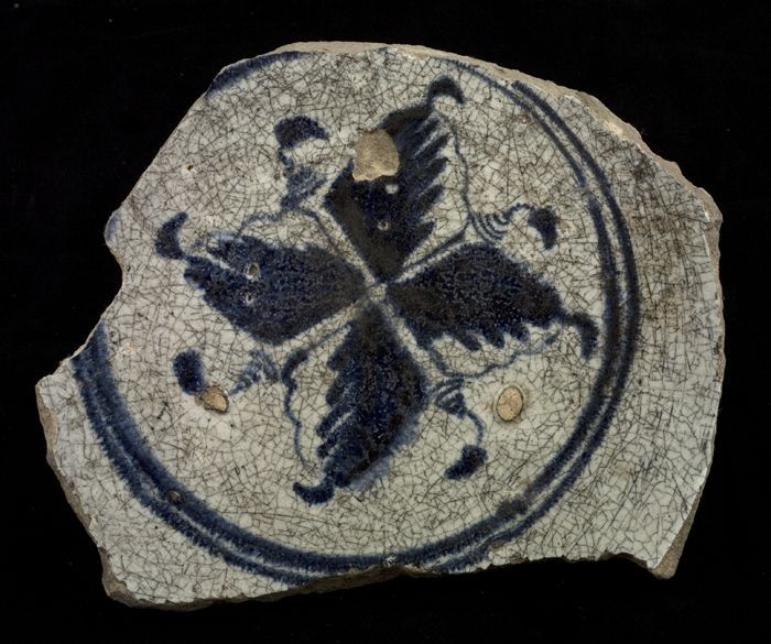 Fragment majolica bord, blauw op wit, met vierbladig...