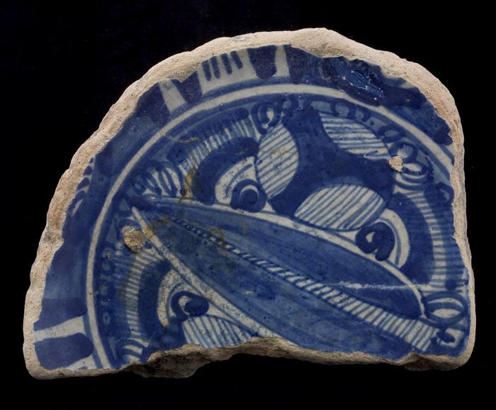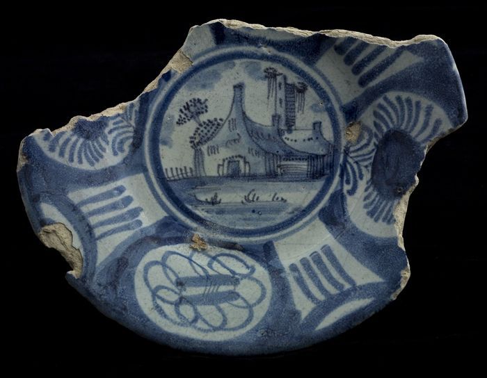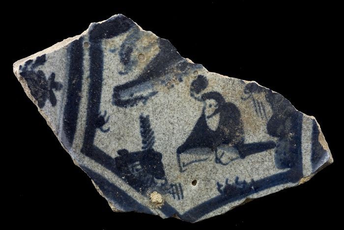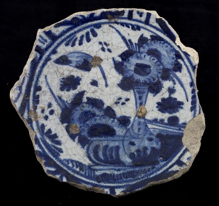 Fragment majolica schotel, blauw op wit, in het midd...
