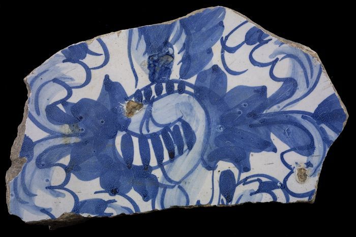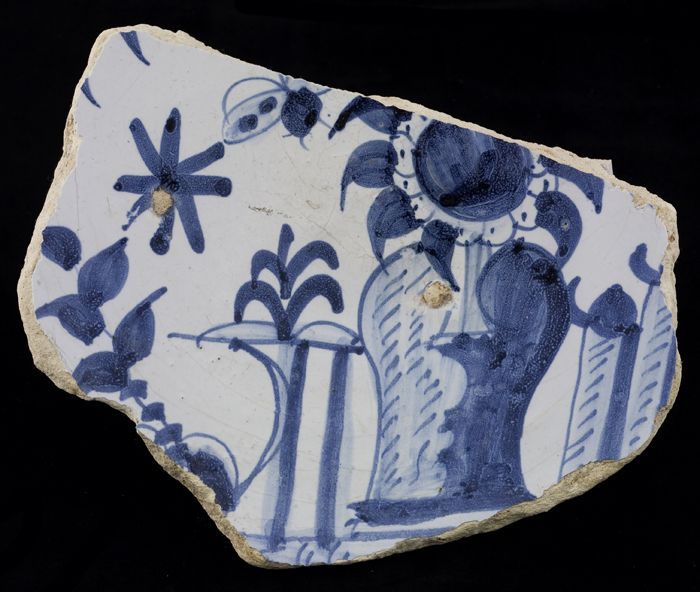 Fragment majolica bord, blauw op wit, met bloemenvaa...