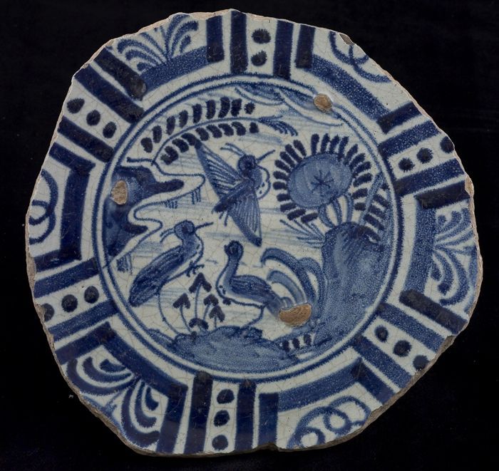 Fragment majolica bord, blauw op wit, met pluimmotie...