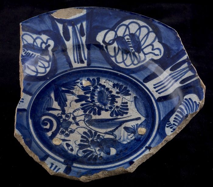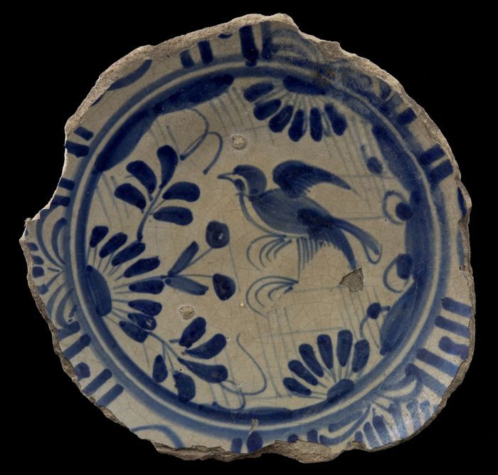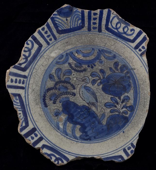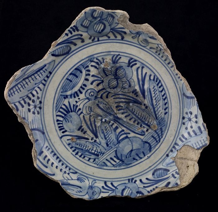 Fragment majolica bord, blauw op wit, vogel in Chine...