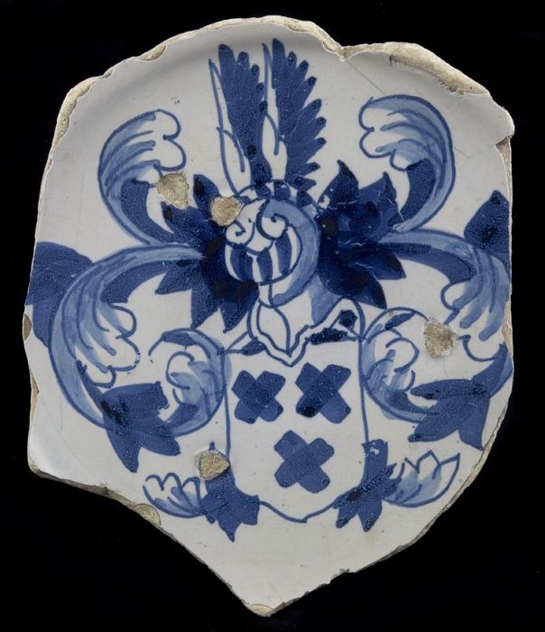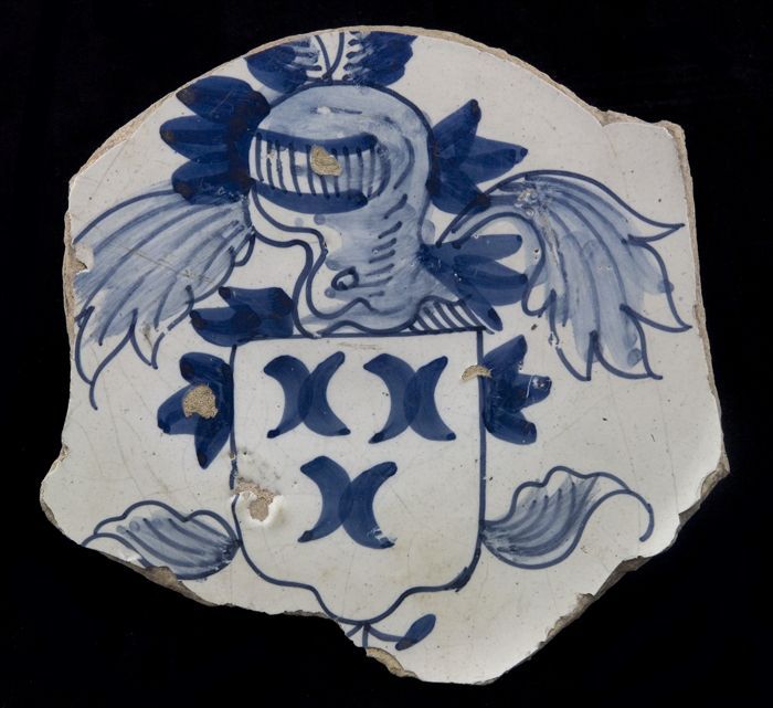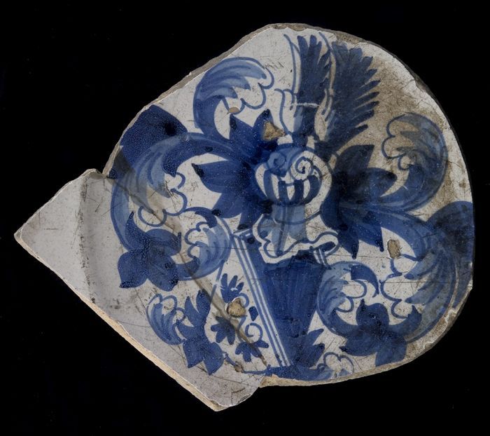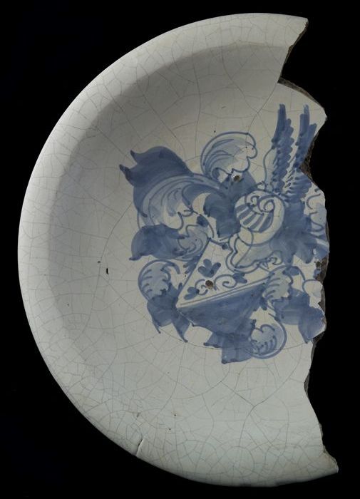 Fragment majolica schotel, blauw op wit, met heraldi...