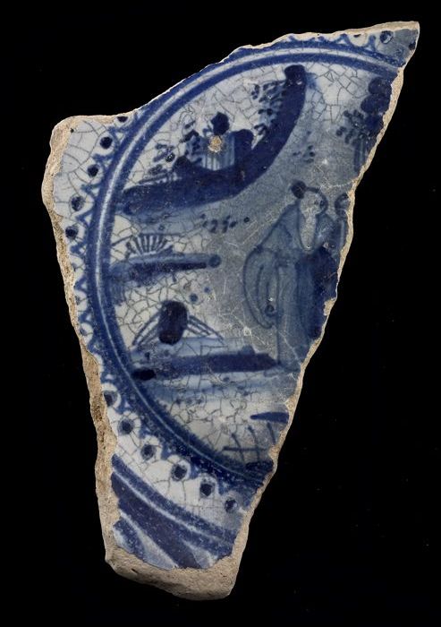 Fragment majolica bord, blauw op wit, Chinees motief...
