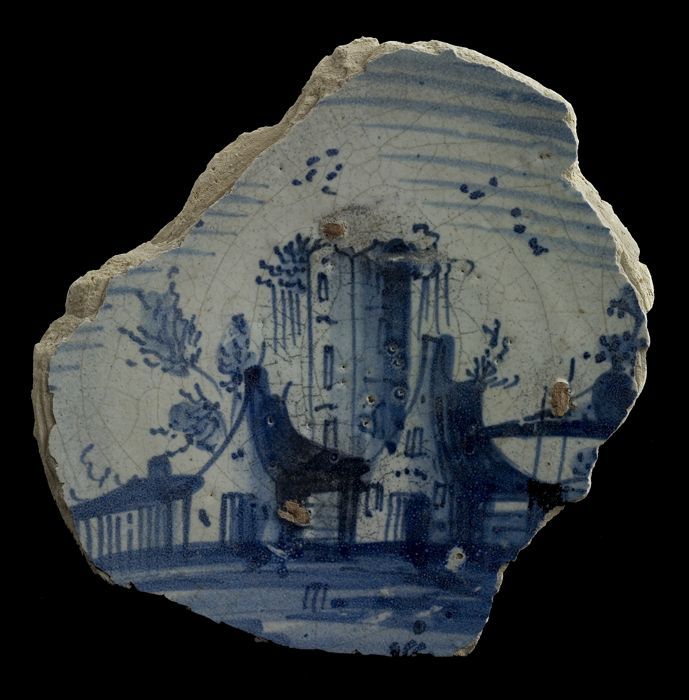 Fragment majolica bord, blauw op wit, landschap met ...