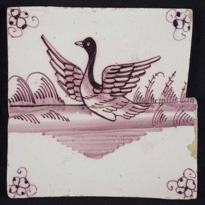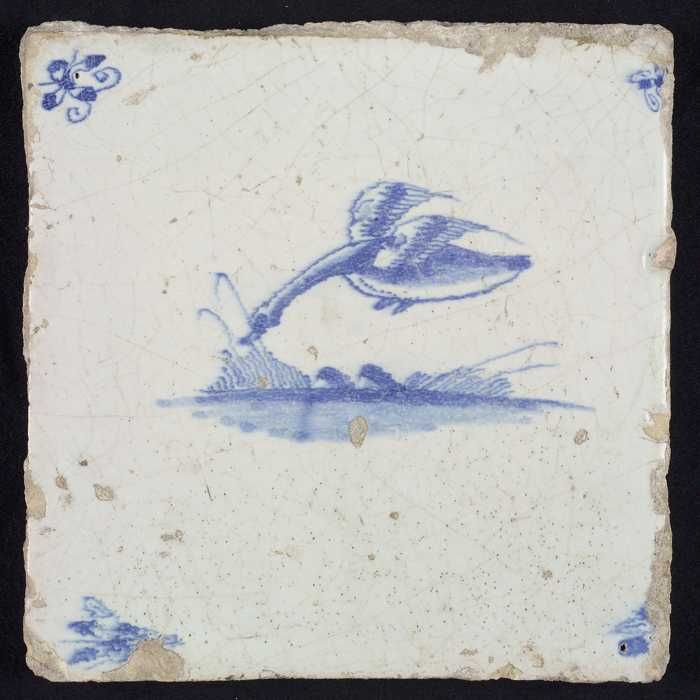 Dierentegel, vliegende vogel boven water, hoekmotief...