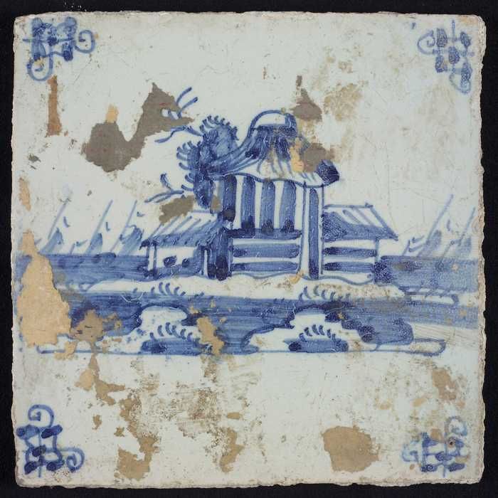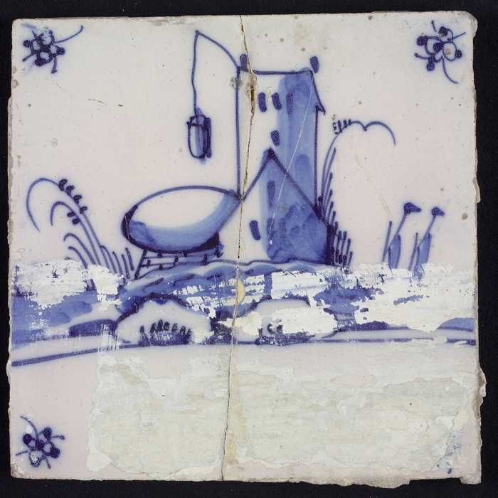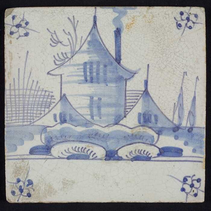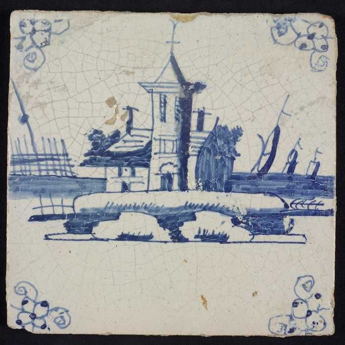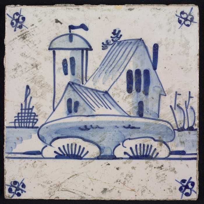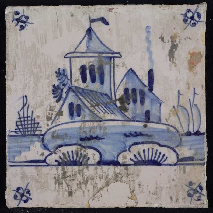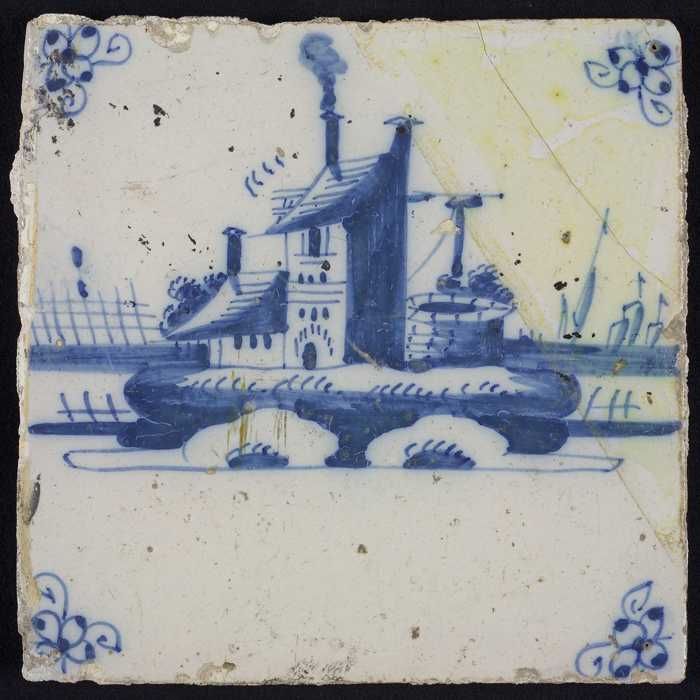 Tafereeltegel, blauw, huis met vuurbaken of waterput...
