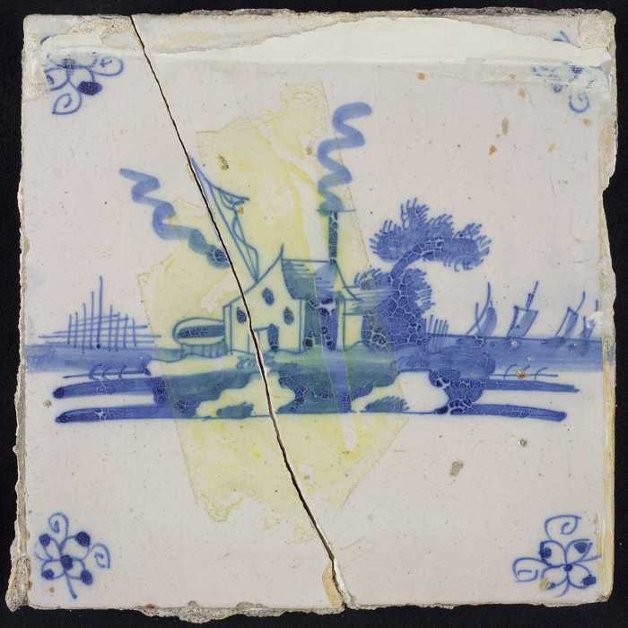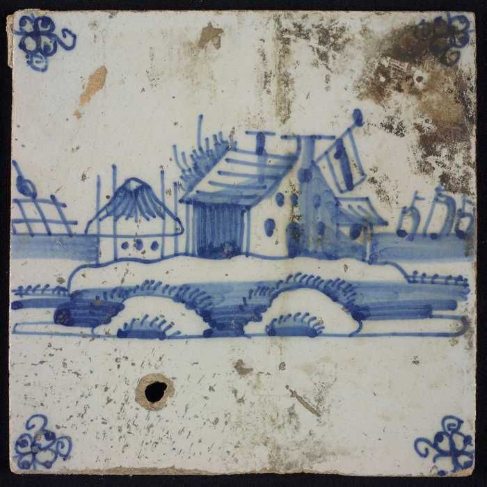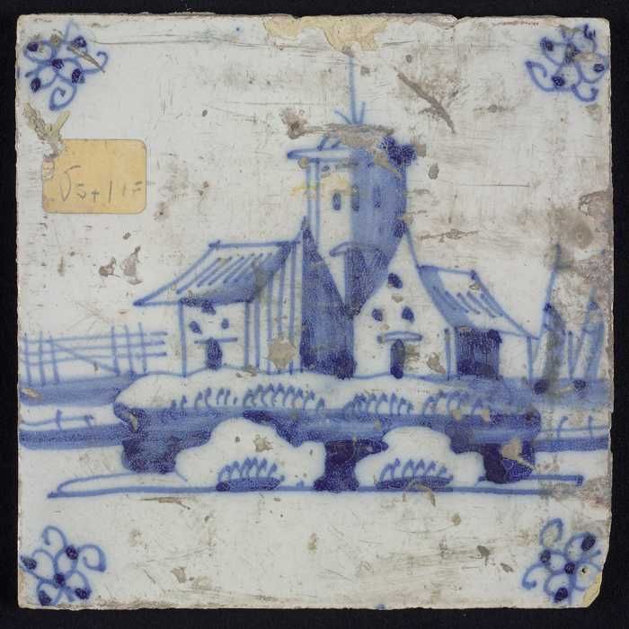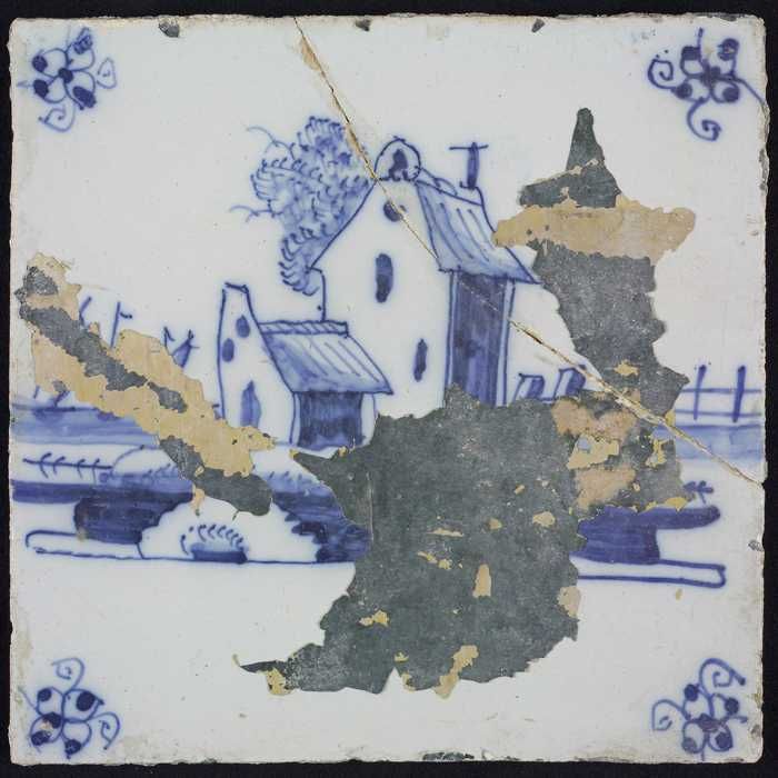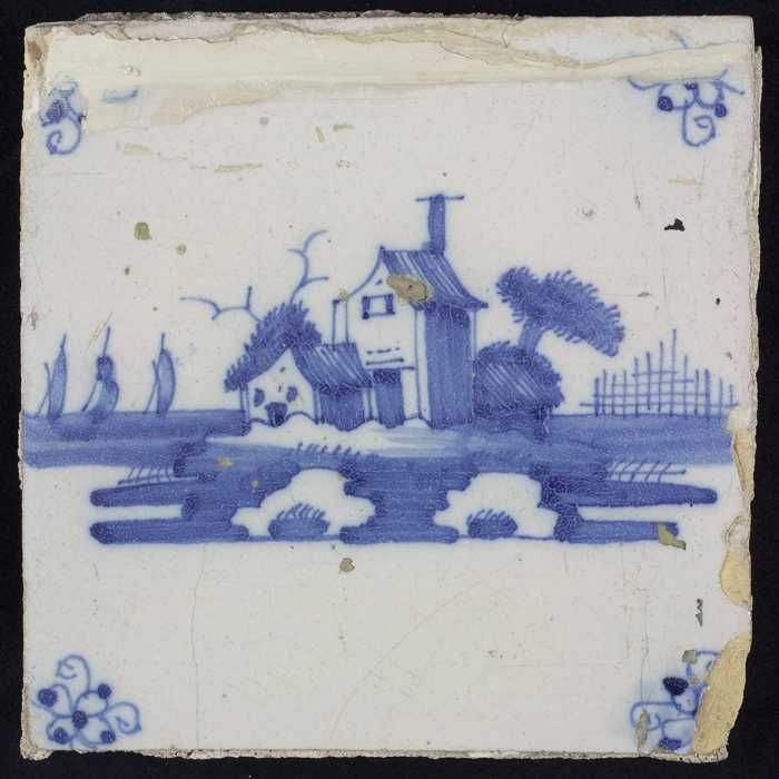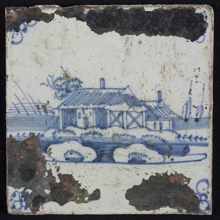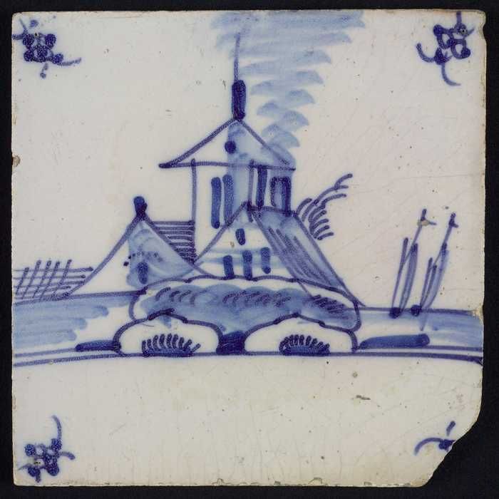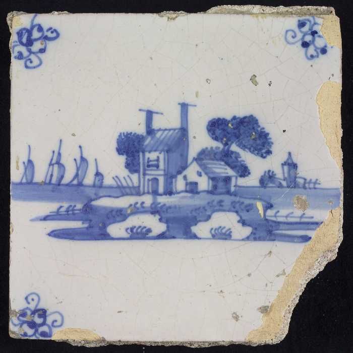 Tafereeltegel, blauw, huis en hooischuur, hoekmotief...