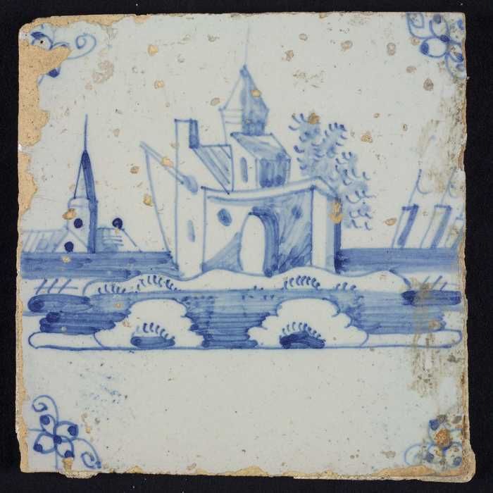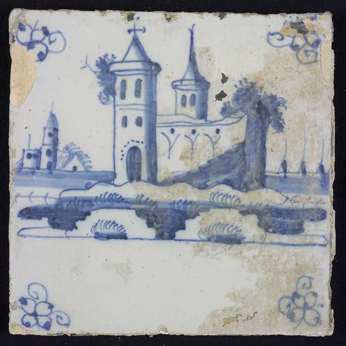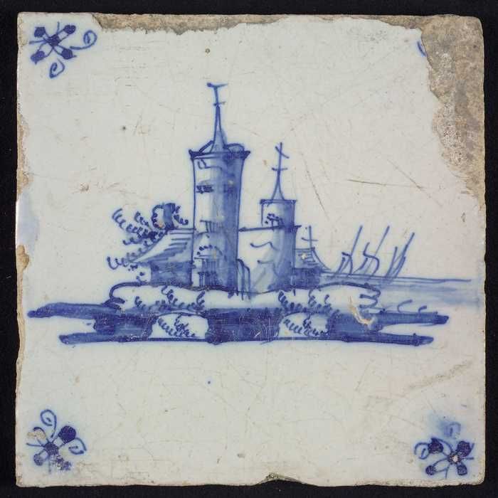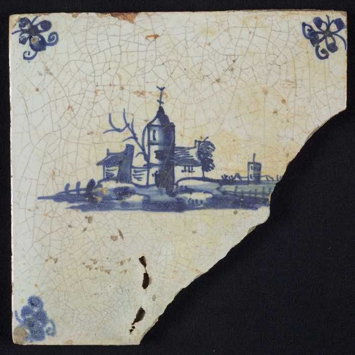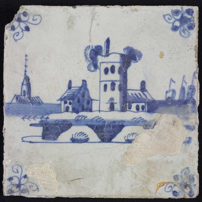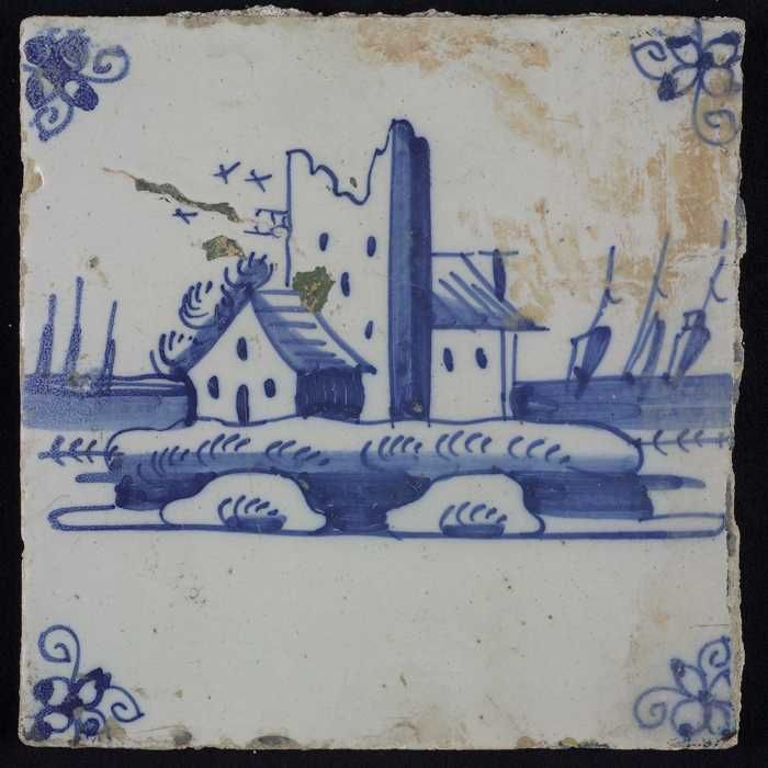 Tafereeltegel, blauw, huizen en torenruïne, hoekmoti...