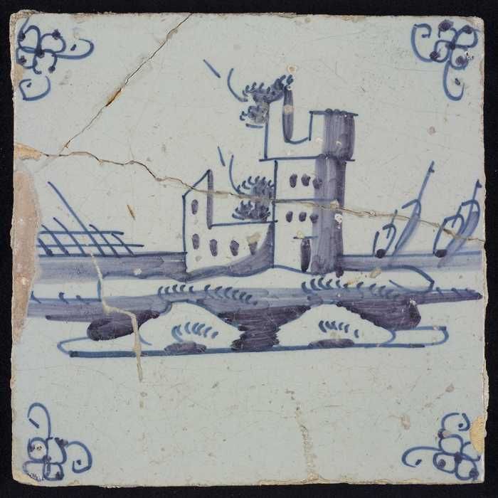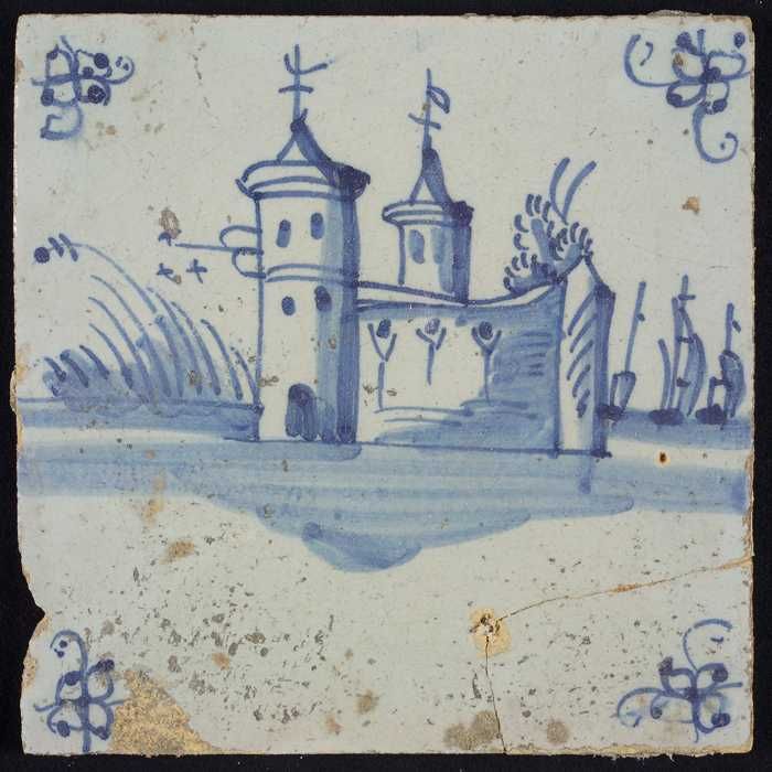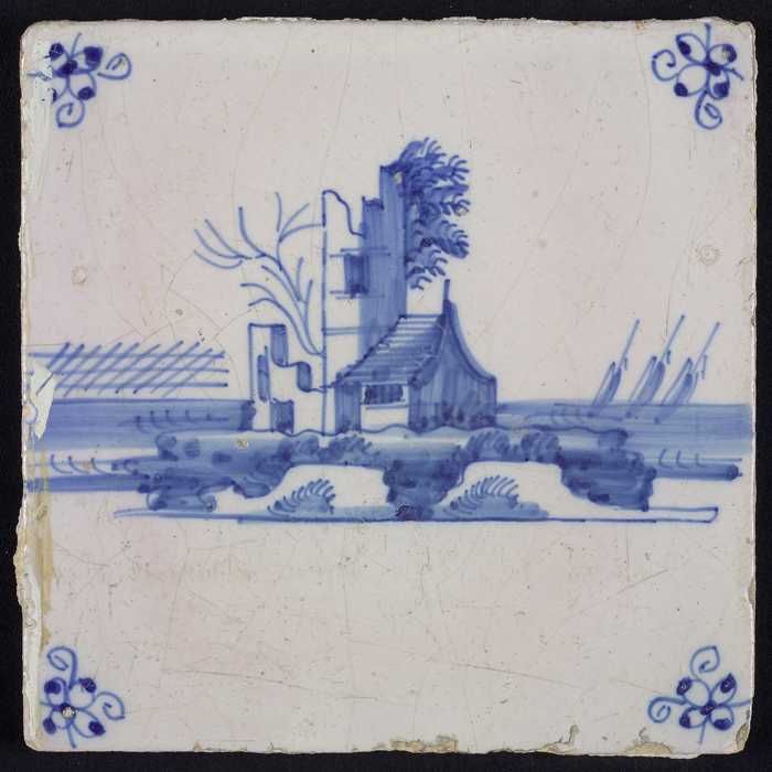 Tafereeltegel, blauw, kasteelruïne en huis, hoekmoti...