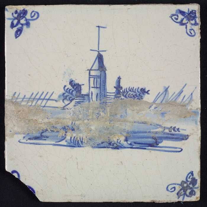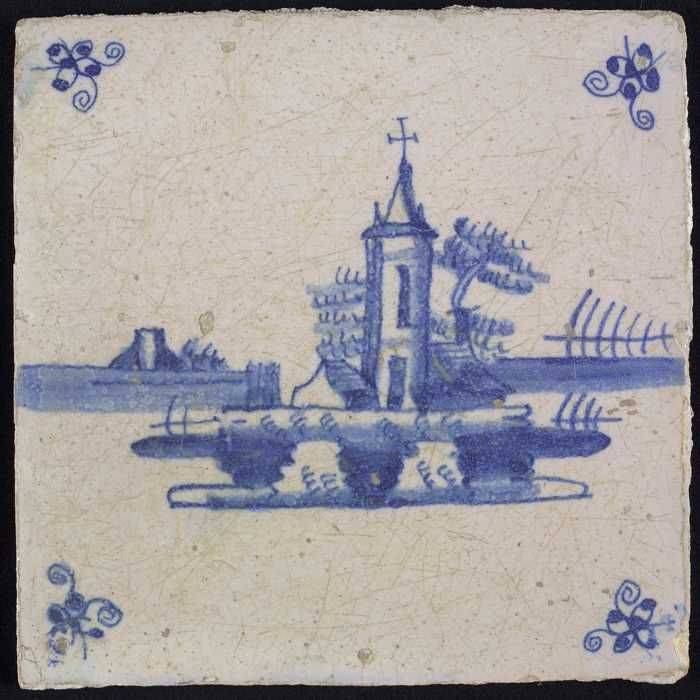 Tafereeltegel, blauw, kerk met toren, hoekmotief spin
