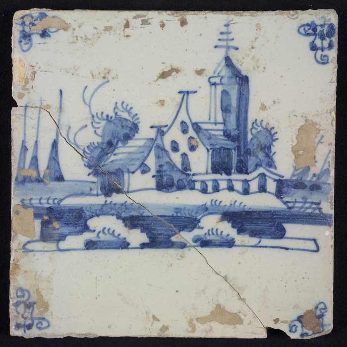 Tafereeltegel, blauw, kerk met spitse toren, hoekmot...