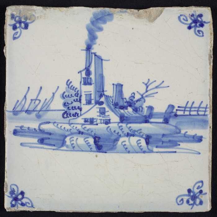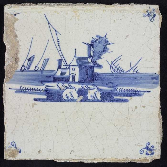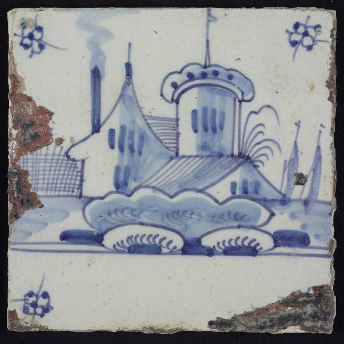 Tafereeltegel, blauw, huis met vuurbaken, hoekmotief...