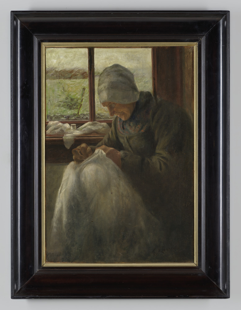 Vrouw met verstelwerk voor raam, door Therese Kassin