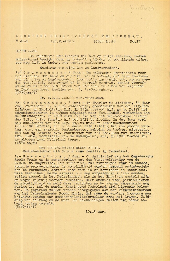 Vel: Algemeen Nederlandsch Persbureau, mededelingen,...