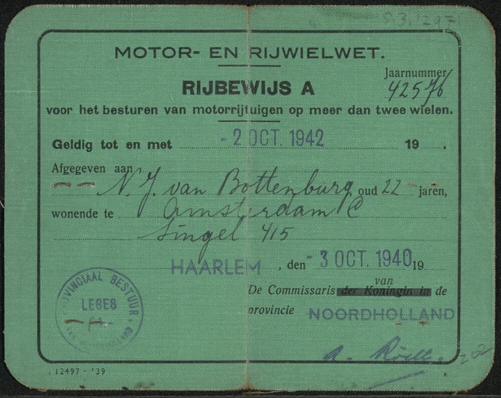 Rijbewijs A, op naam van N.J. van Bottenburg.