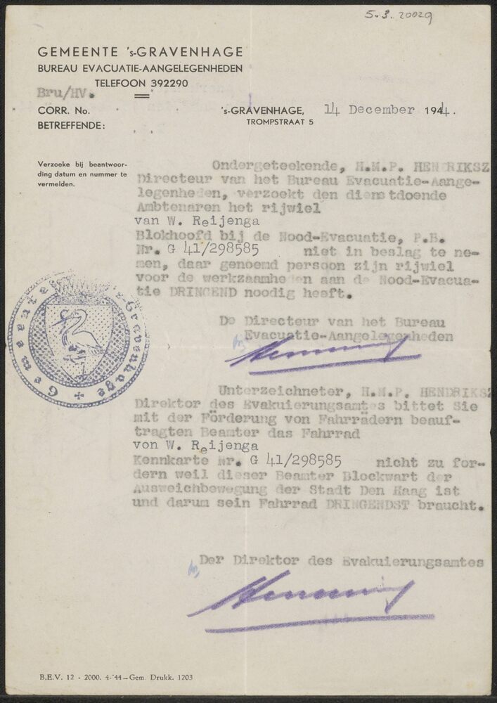 Brief van de Gemeente 's-Gravenhage.