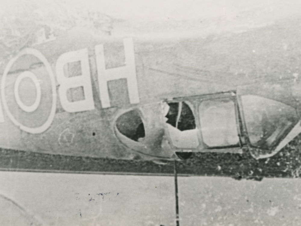 Foto van wrak van een Brits Mustang jachtvliegtuig. ...
