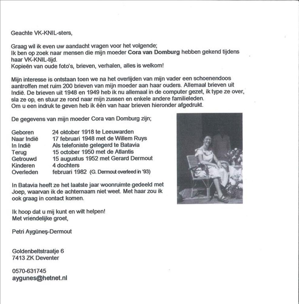 Brief met informatieverzoek over Vrouwenkorps KNIL, ...