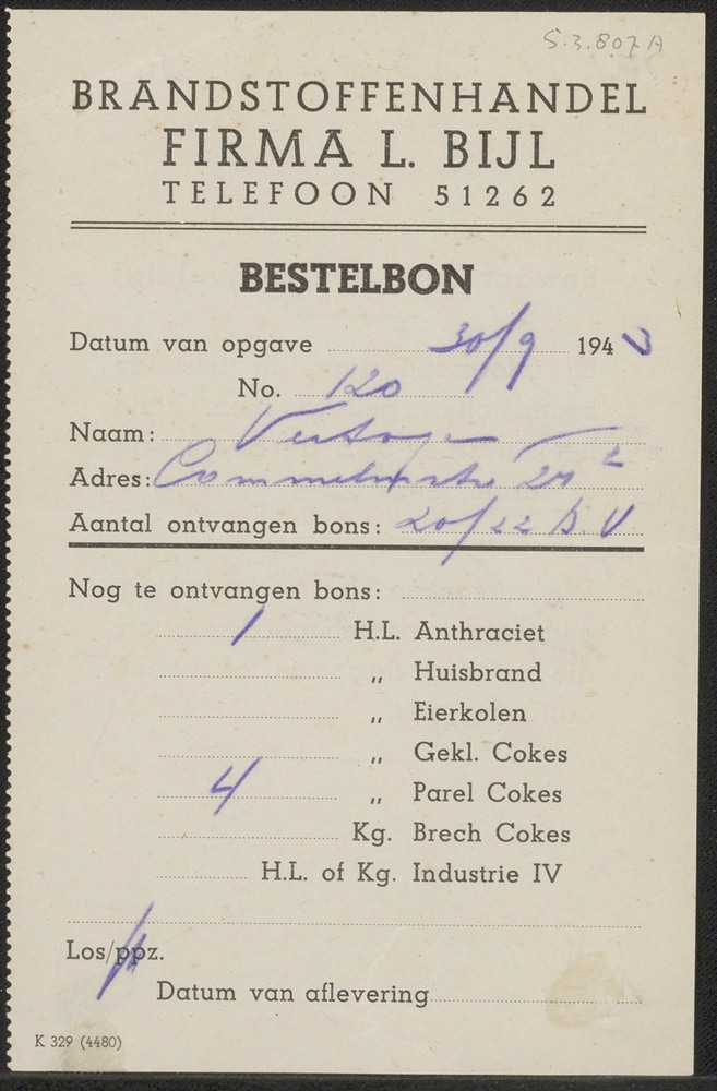Bestelbon van wed. Vertogen bij Fa. L. Bijl