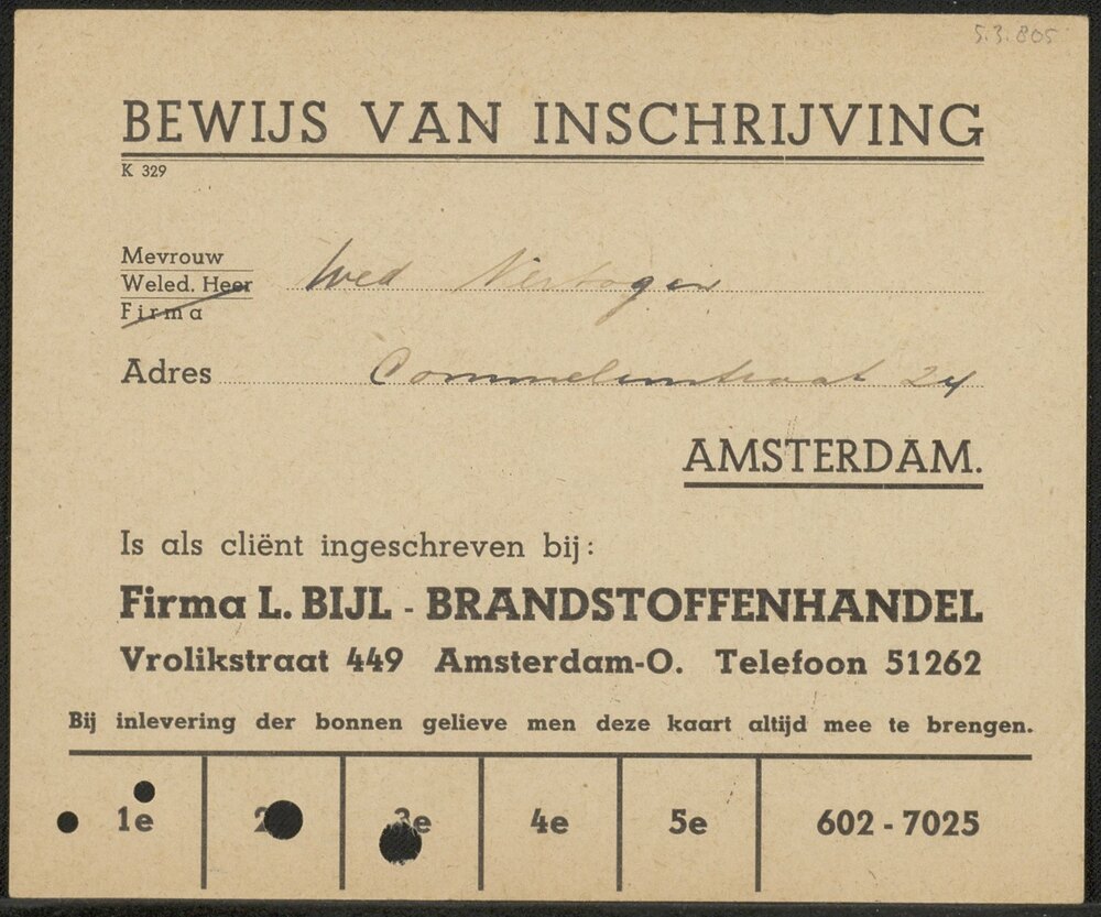 Bewijs van inschrijving wed. Vertogen bij Fa. L. Bijl