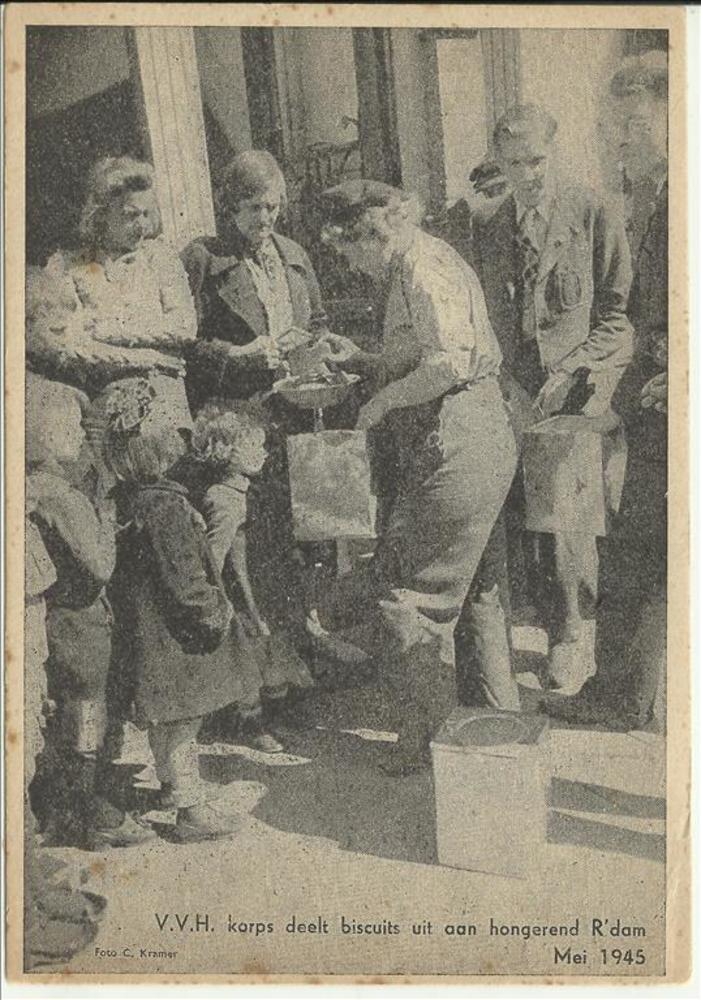 Voedselschaarste V.V.H. korps deelt biscuits uit aan...