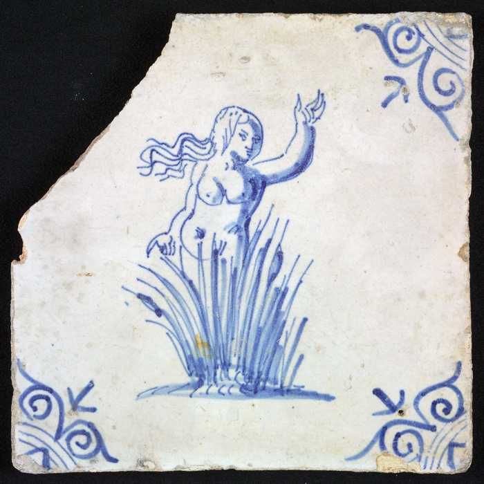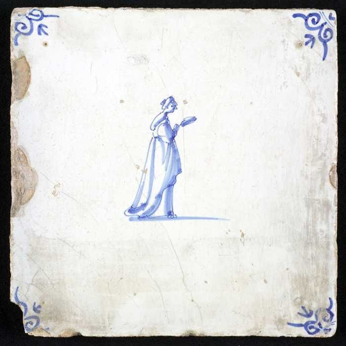 Figuurtegel, blauw, vrouw met spiegel, hoekmotief os...