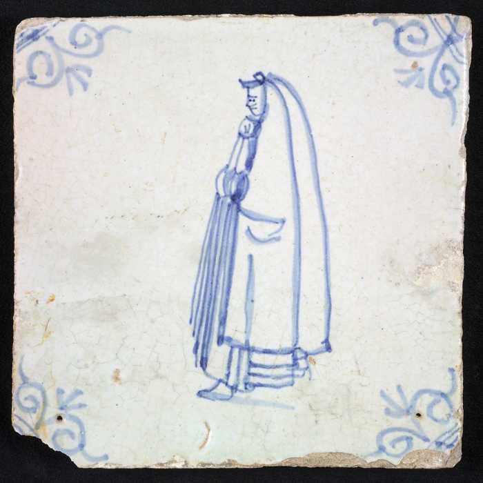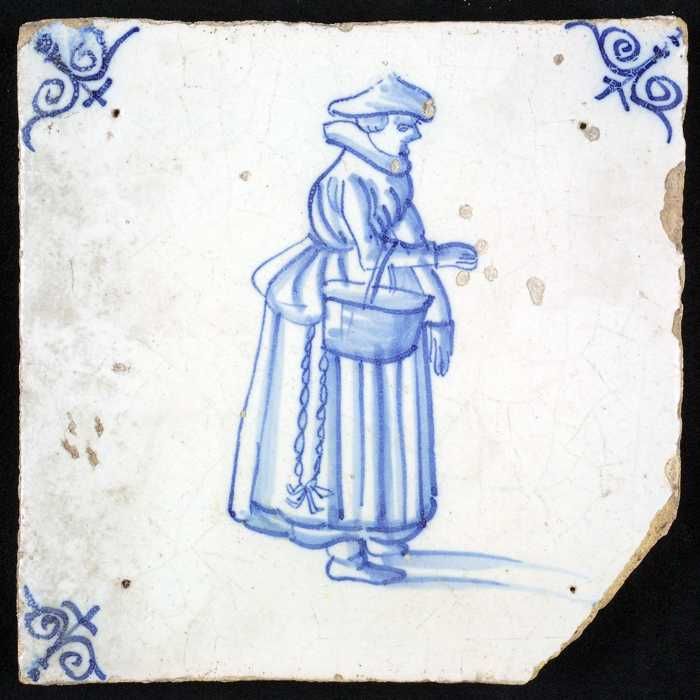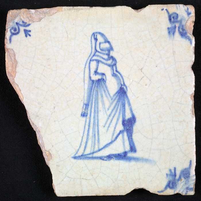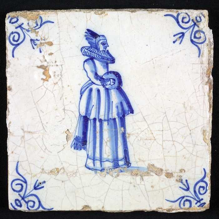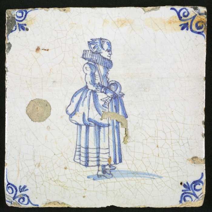 Figuurtegel, blauw, vrouw met molensteenkraag en mof...