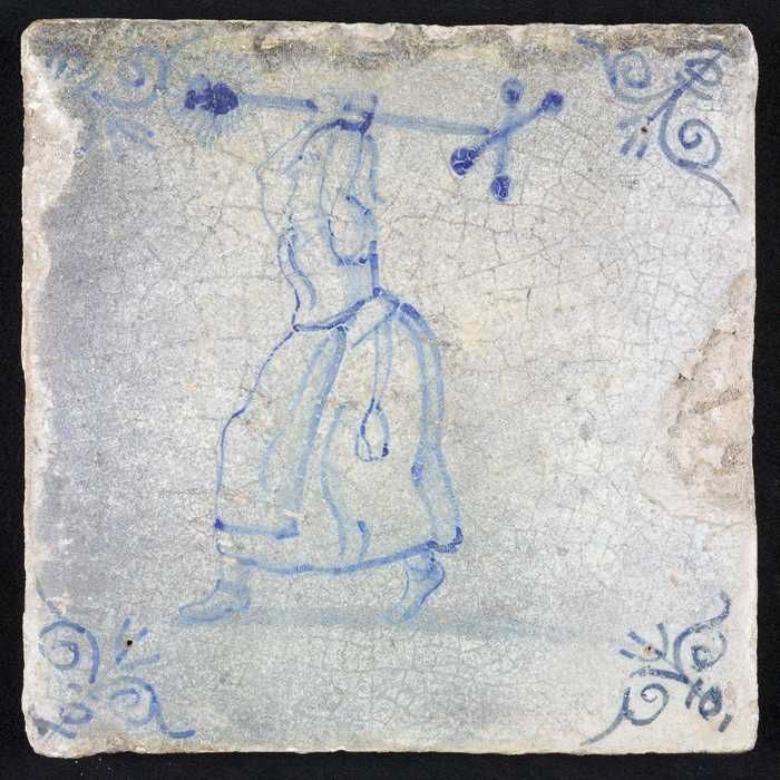 Figuurtegel, blauw, vrouw met pakket of vat op de ru...