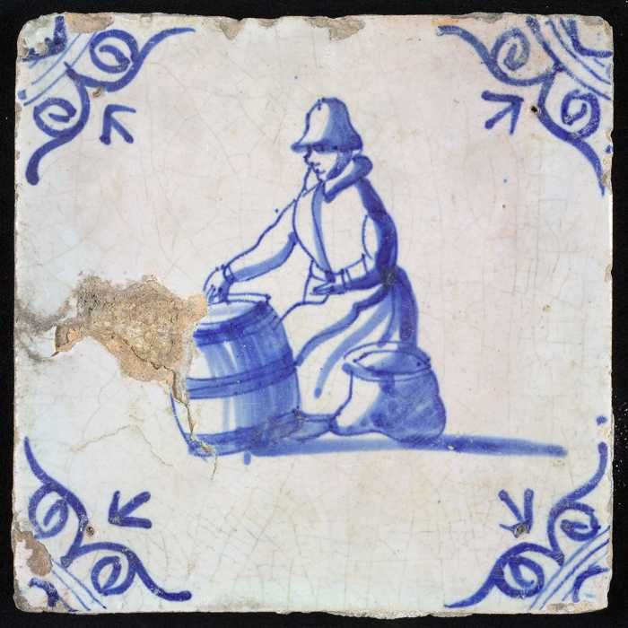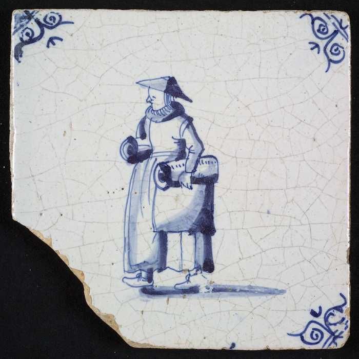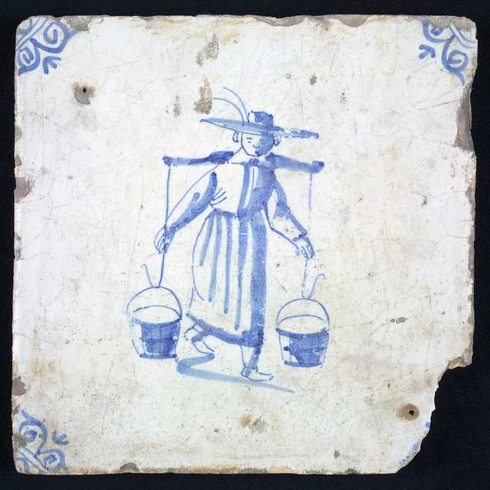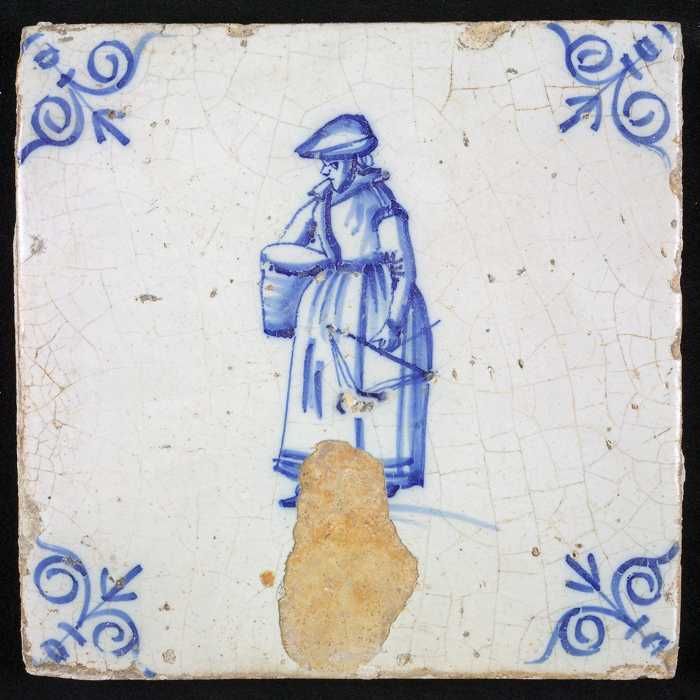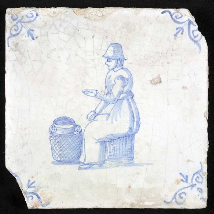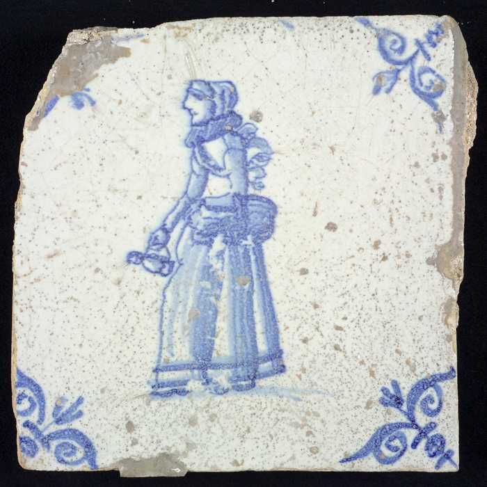 Figuurtegel, blauw, marktkoopvrouw met kruik, hoekmo...