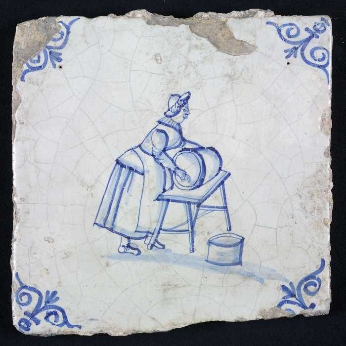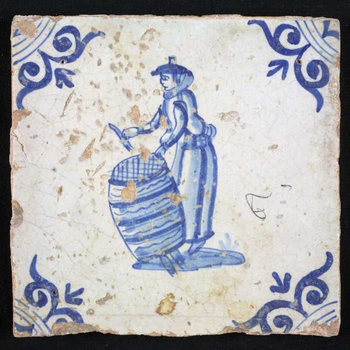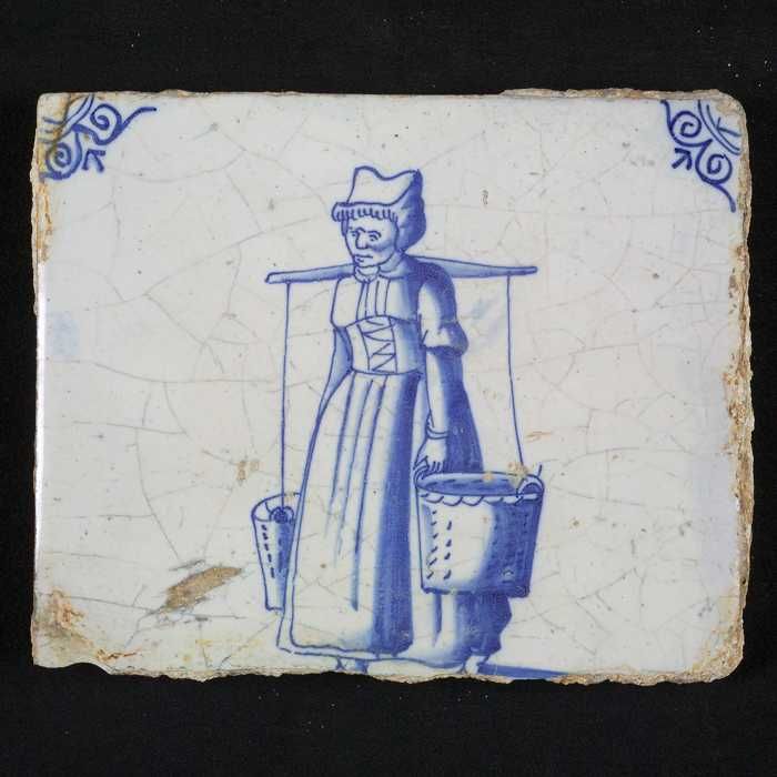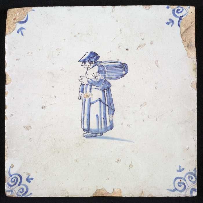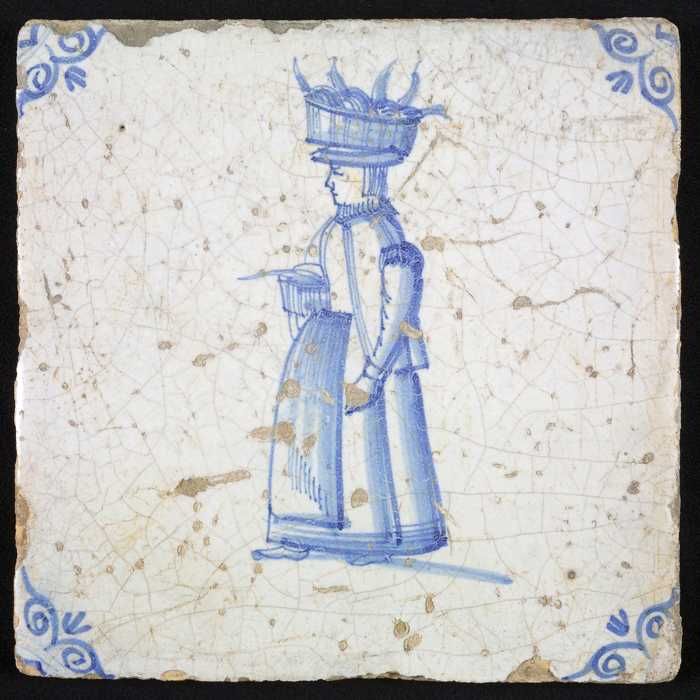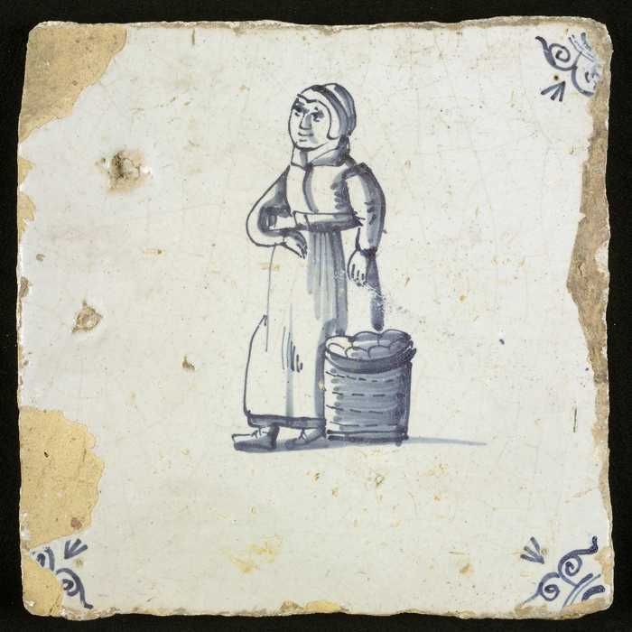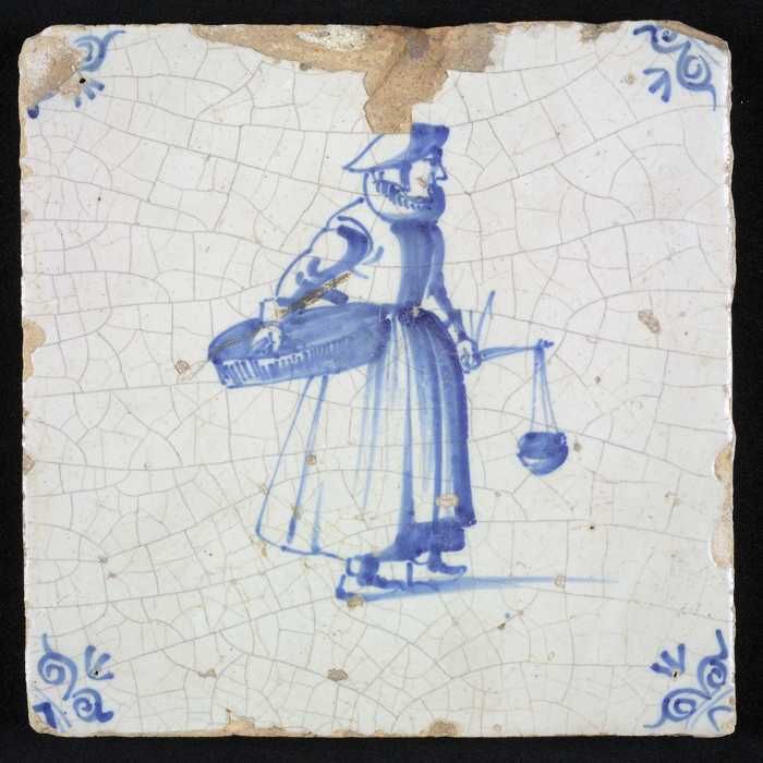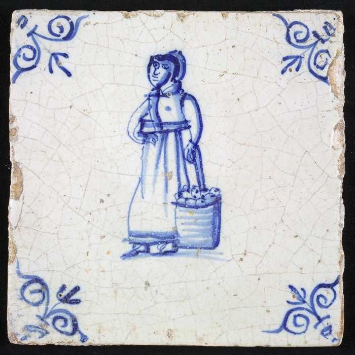 Figuurtegel, blauw, marktkoopvrouw met gepofte kasta...