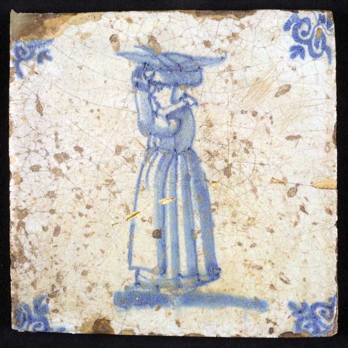 Figuurtegel, blauw, vrouw met hoed en mand, hoekmoti...