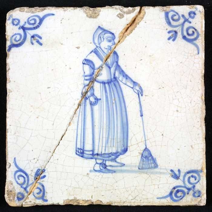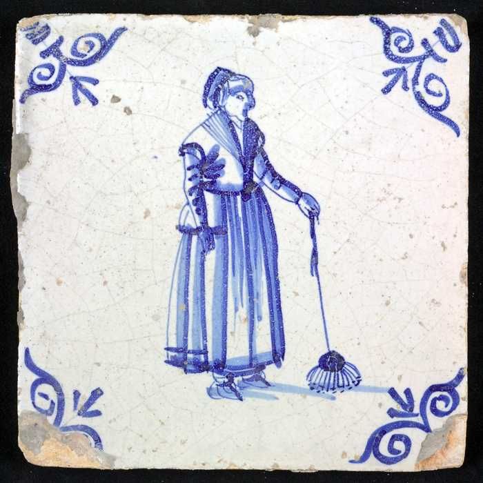 Figuurtegel, blauw, vrouw met een bezem, hoekmotief ...