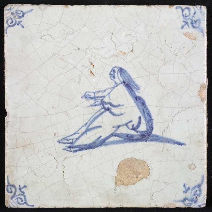 Figuurtegel, blauw, vrouw zittend op de grond, hoekm...