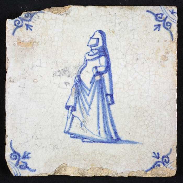 Figuurtegel, blauw, vrouw met molensteenkraag, hoekm...