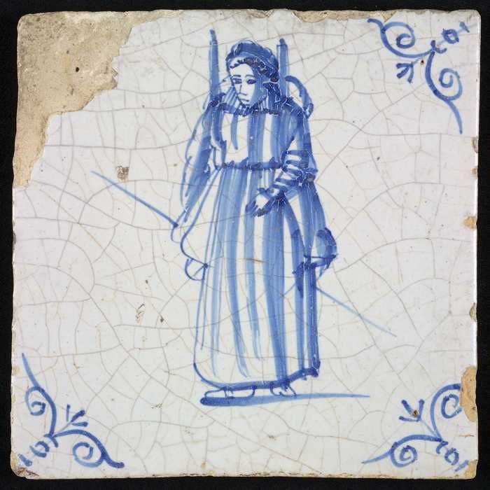 Figuurtegel, blauw, vrouw met een staaf en kruispoot...