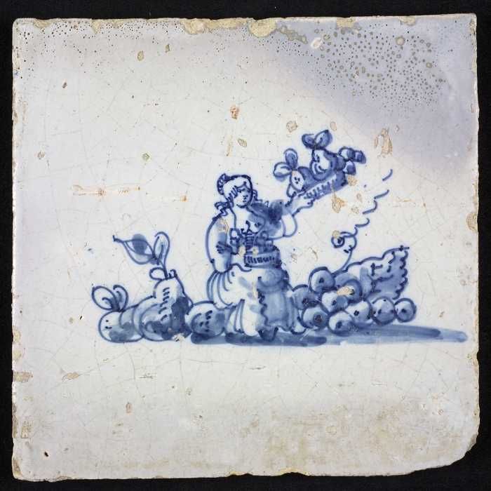 Figuurtegel, blauw, vrouw met mand en weegschaal, ho...