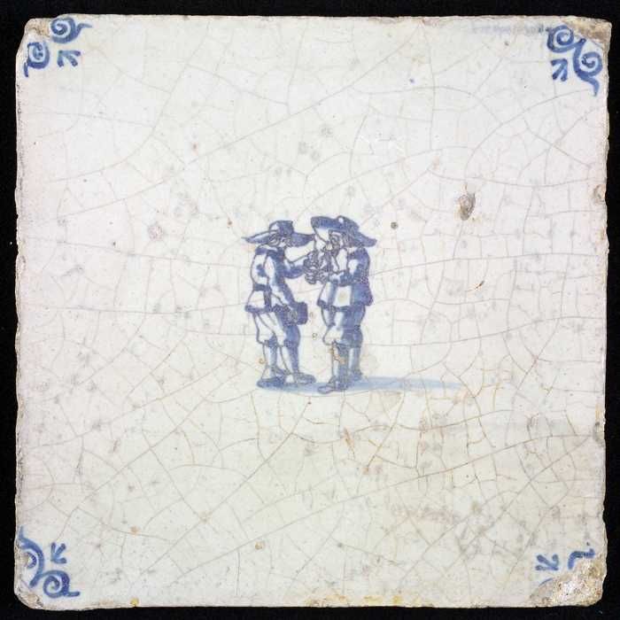 Figuurtegel, blauw, twee mannen met bierkannen (?), ...