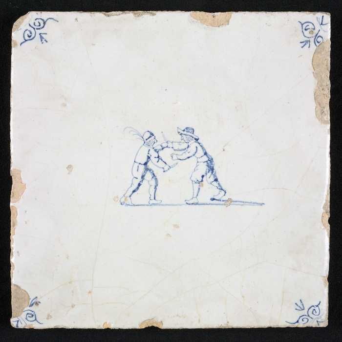 Figuurtegel, blauw, twee vechtende mannen, hoekmotie...