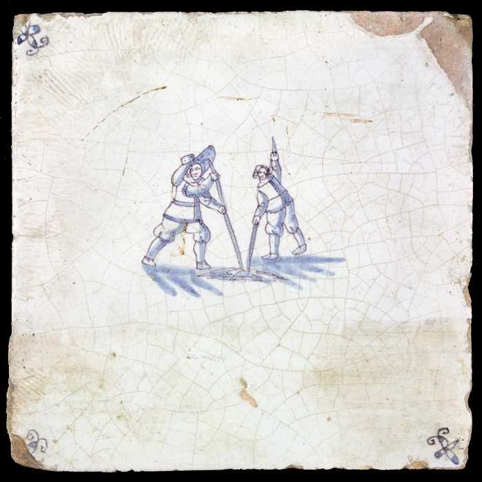 Figuurtegel, blauw, twee mannen met stokken, hoekmot...