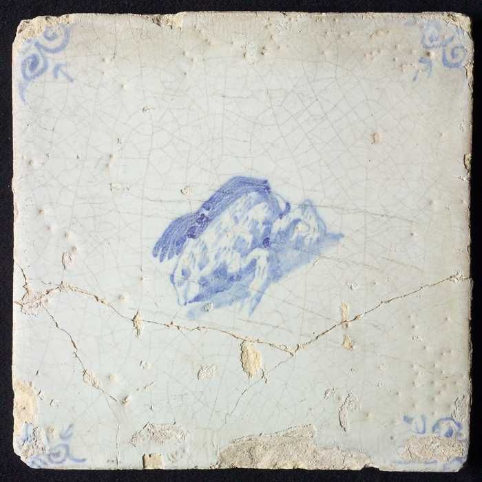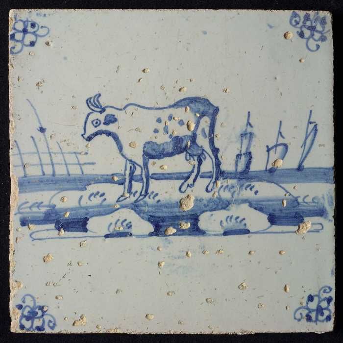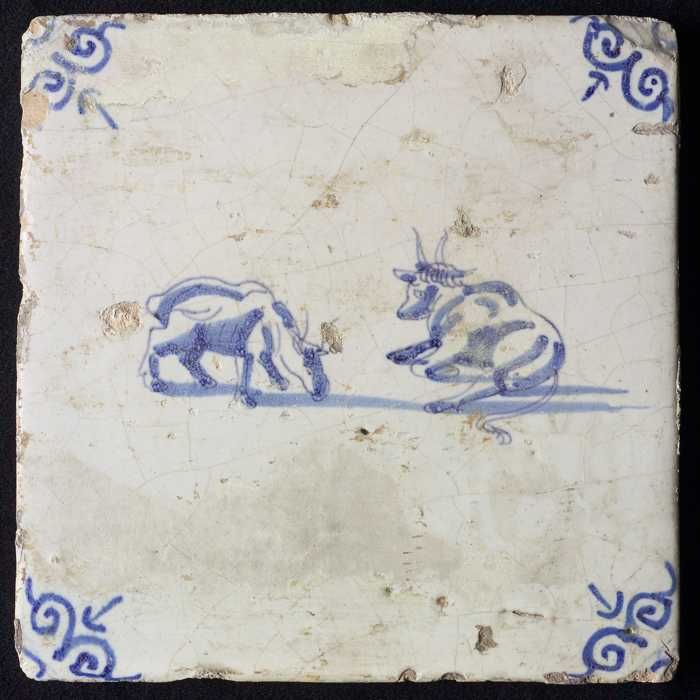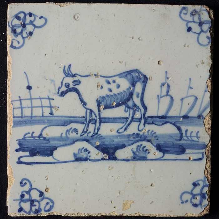 Figuurtegel, blauw, melkmeisje, hoekmotief ossenkop
