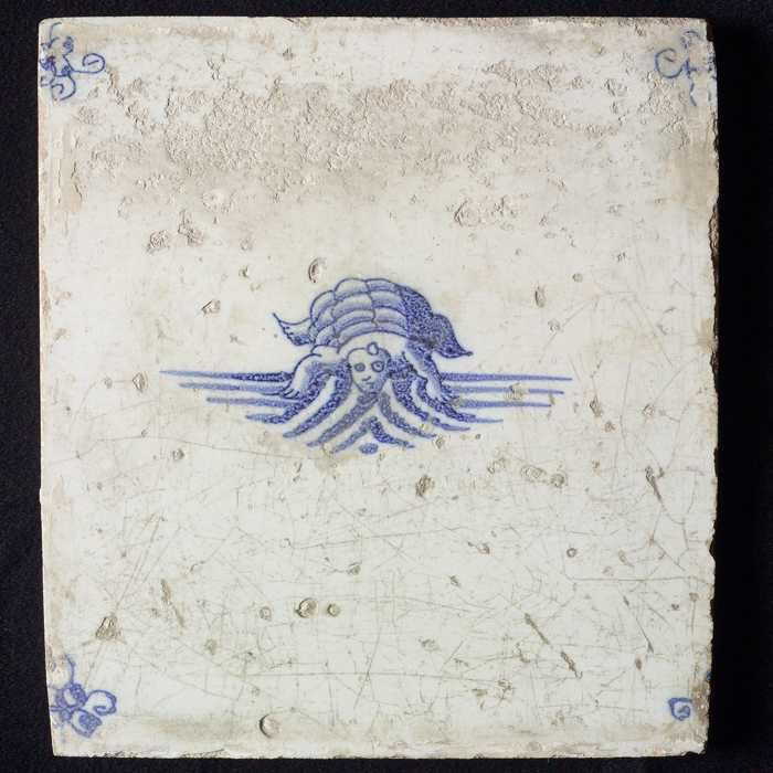 Figuurtegel, blauw, visverkoopster, hoekmotief ossenkop