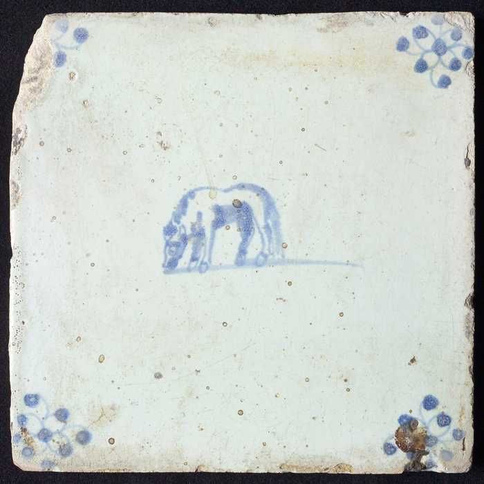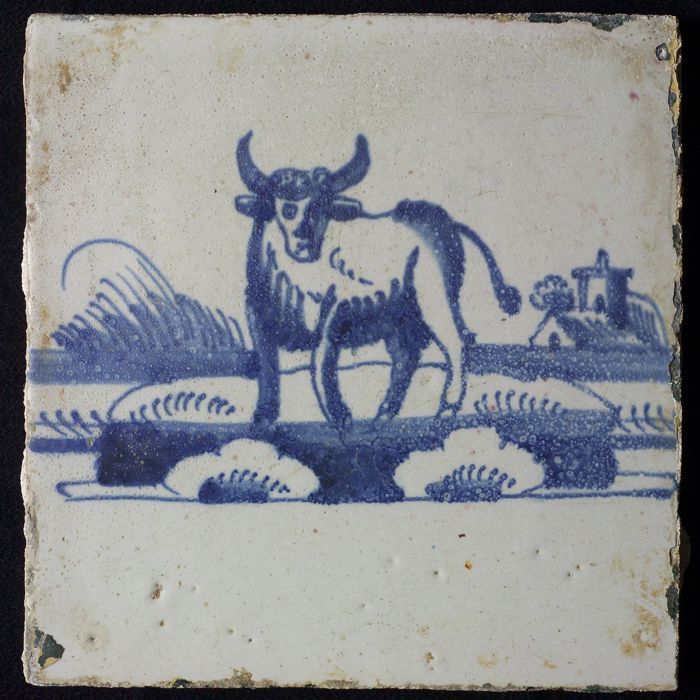 Dierentegel, grazende os naar links, in blauw op wit...