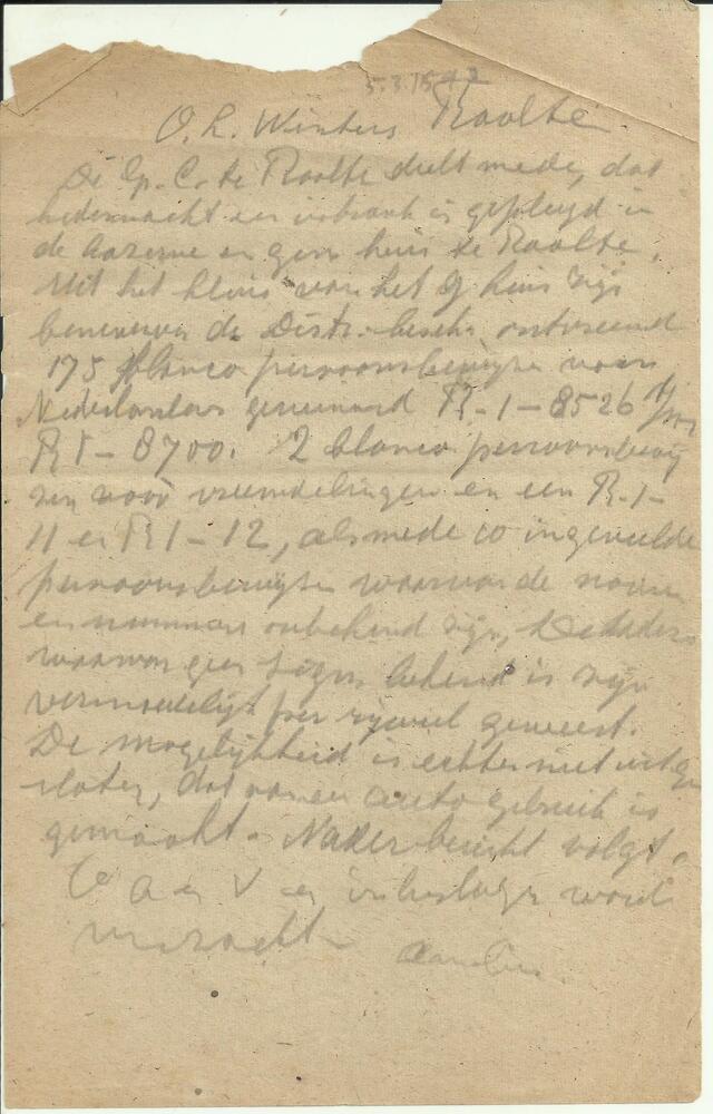 Handgeschreven alarmeringsbericht, betreffende inbra...