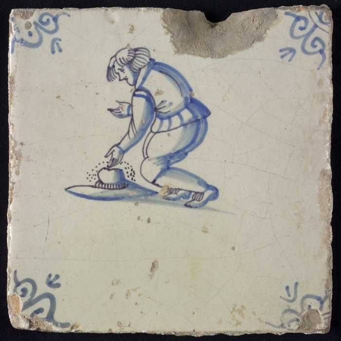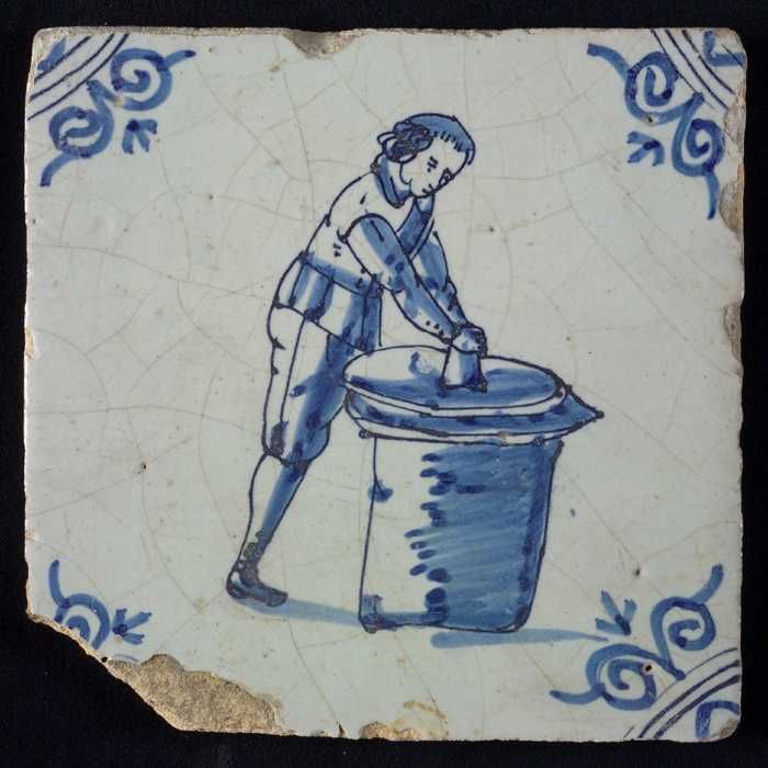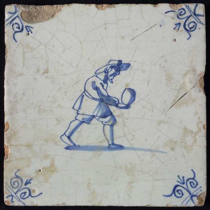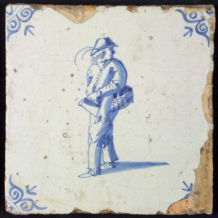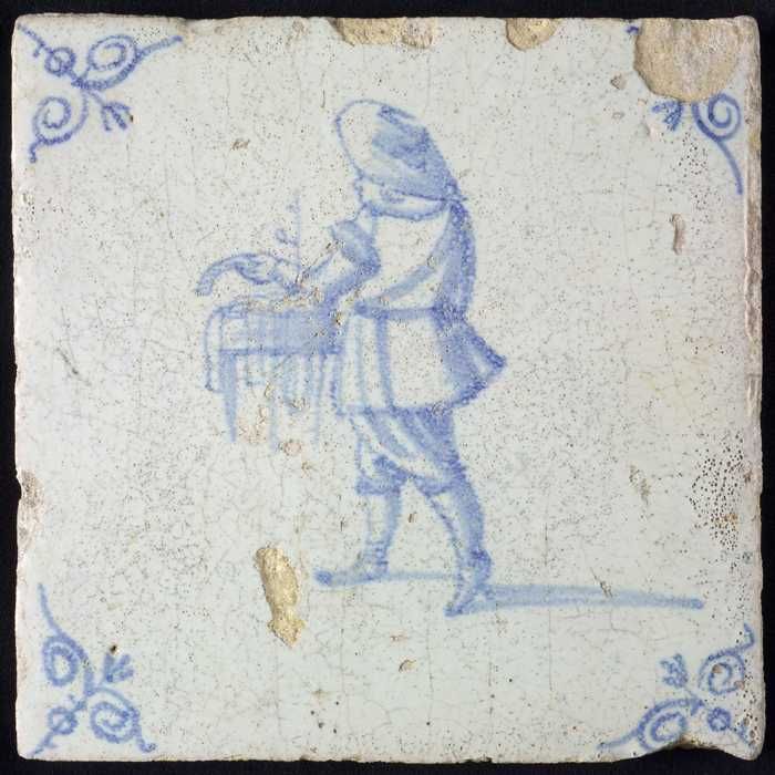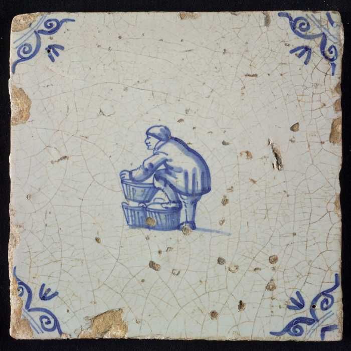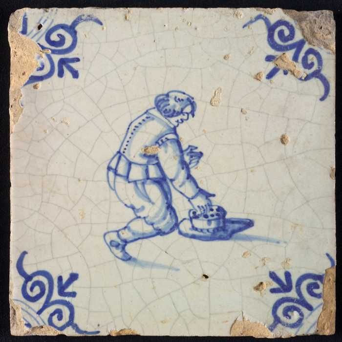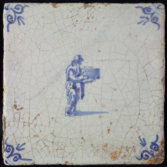 Figuurtegel, blauw, man met een stapel in de handen,...
