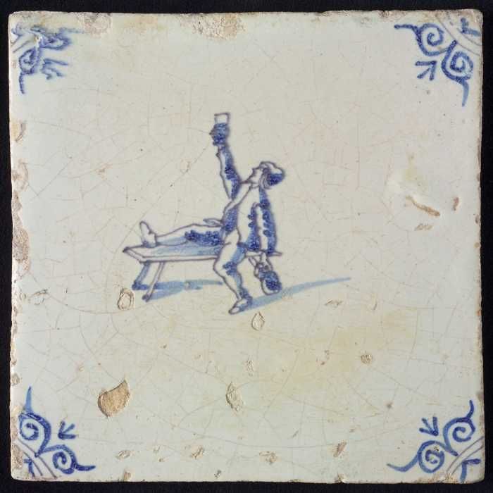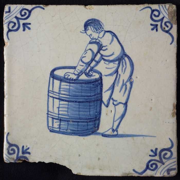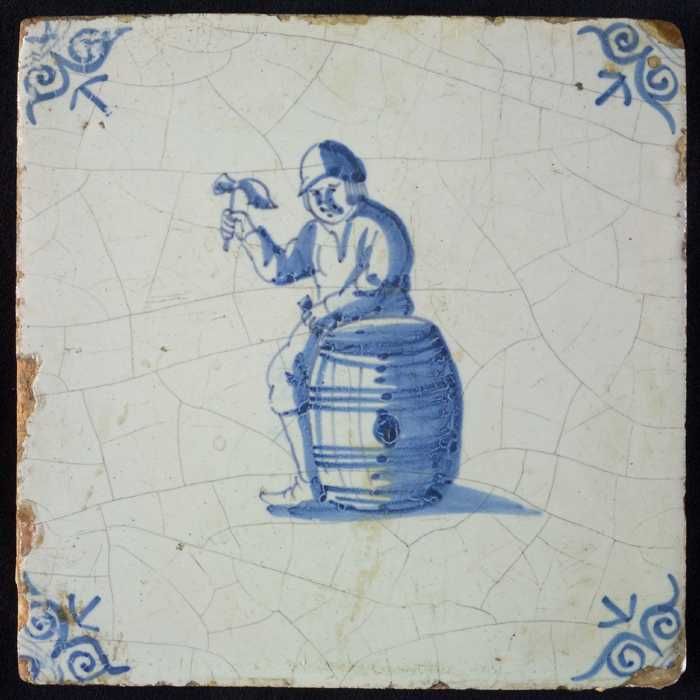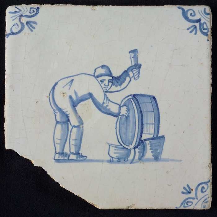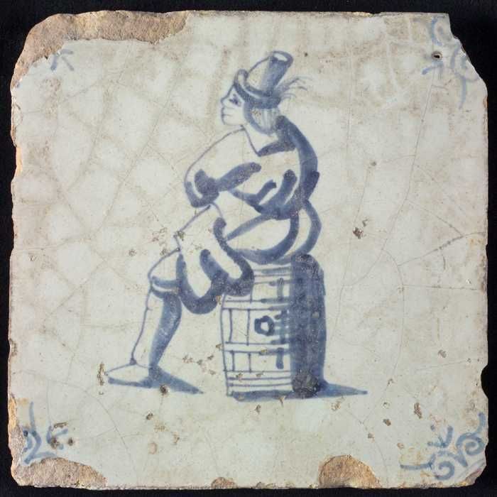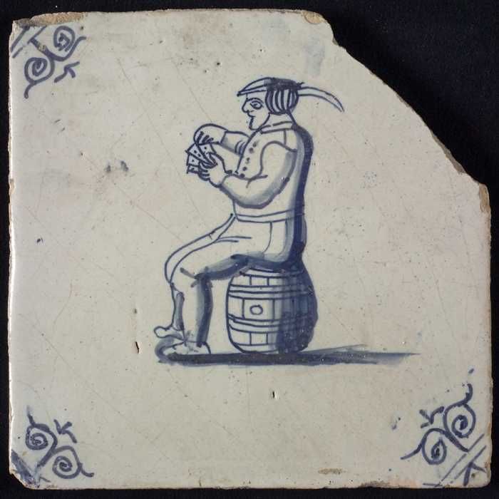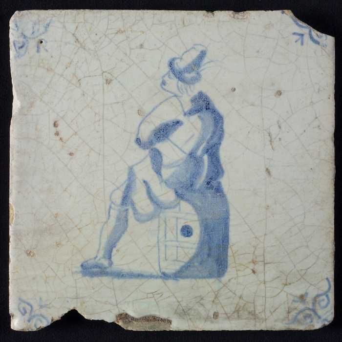 Figuurtegel, blauw, man zittend op een vat, hoekmoti...