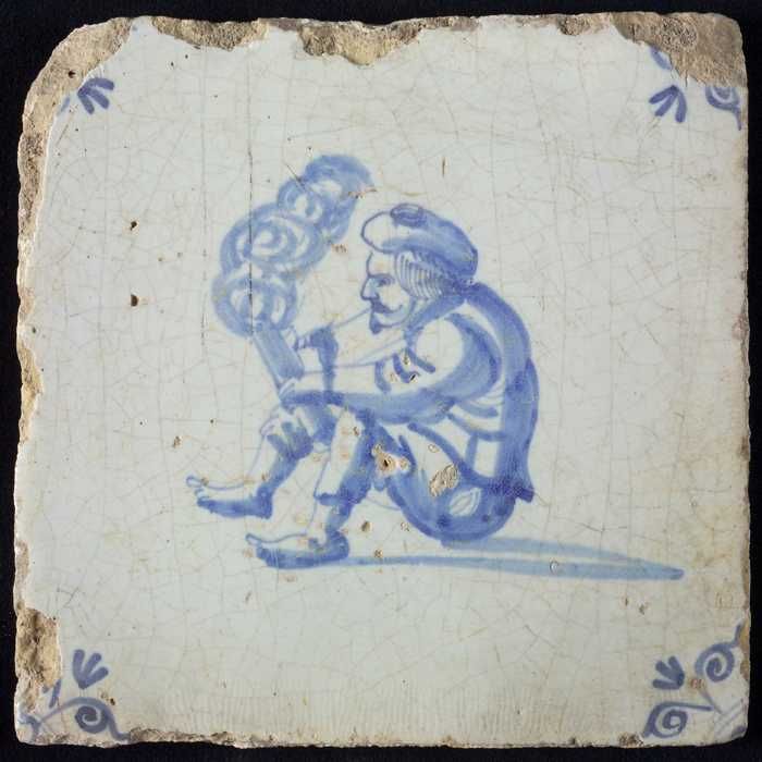 Tegel met een zittende man met baret die een rokende...
