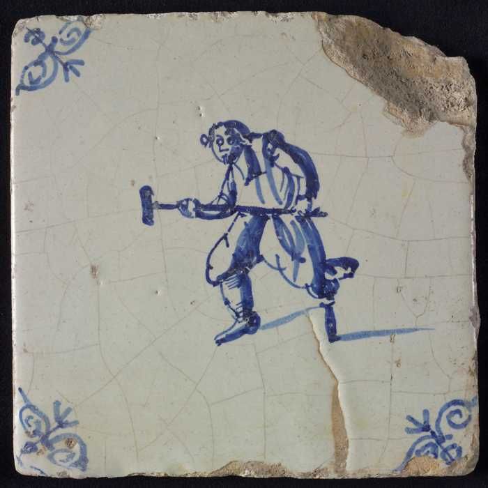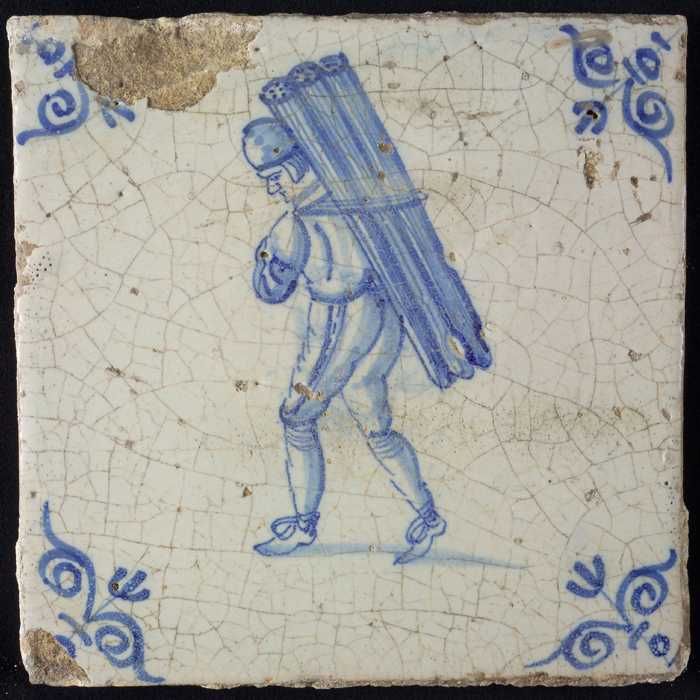 Figuurtegel, blauw, man met buizen op zijn rug, hoek...