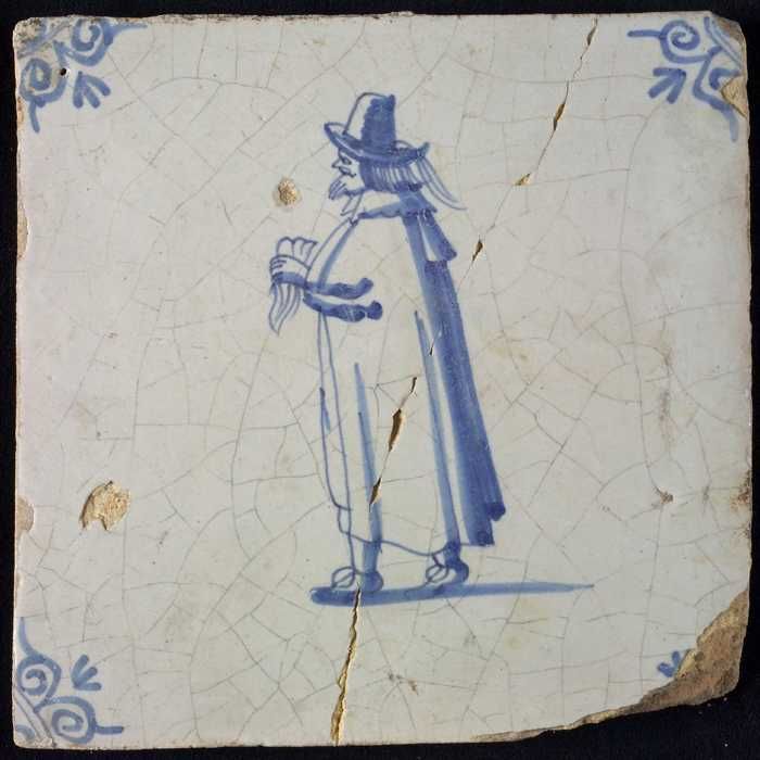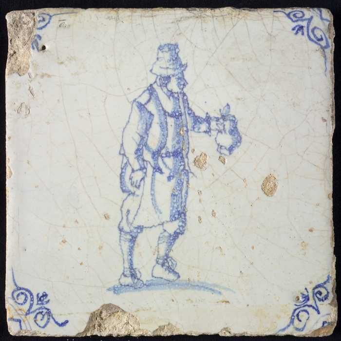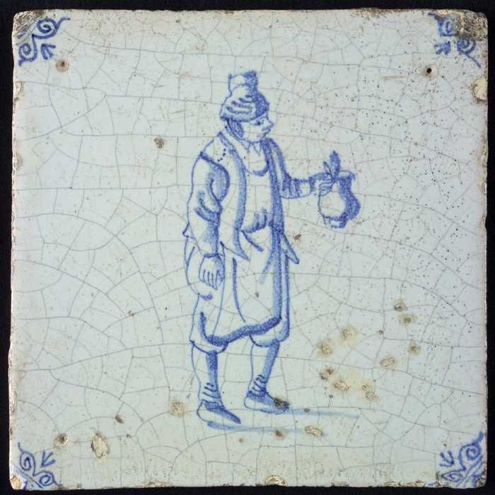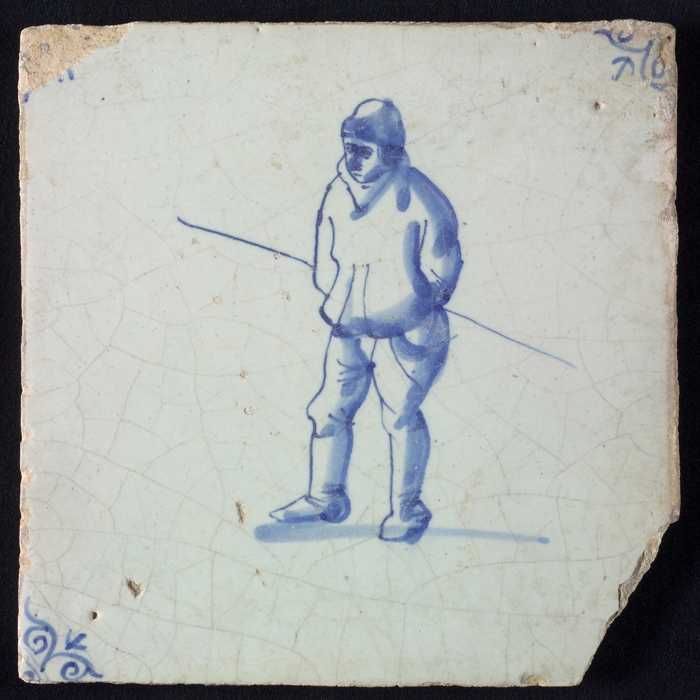 Figuurtegel, blauw, staande man met een staf, hoekmo...